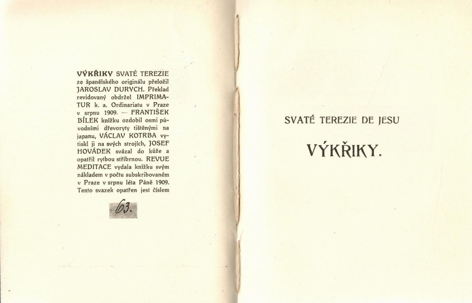 Ex. číslo 63 z neudaného počtu vydaných exemplářů tištěných pouze pro subskribenty. Šesti původními celostr. dřevoryty tištěnými na japan vyzdobil František Bíkek, krom toho pův. dřevoryt Bílkův na tit. listu a dvě drobné viněty. Ze španělského originálu přeložil Václav Durych a na svých strojích knihu vytiskl Václav Kotrba. Do kůže svázal Josef Hovádek a na přední desku vyryl a postříbřil název.