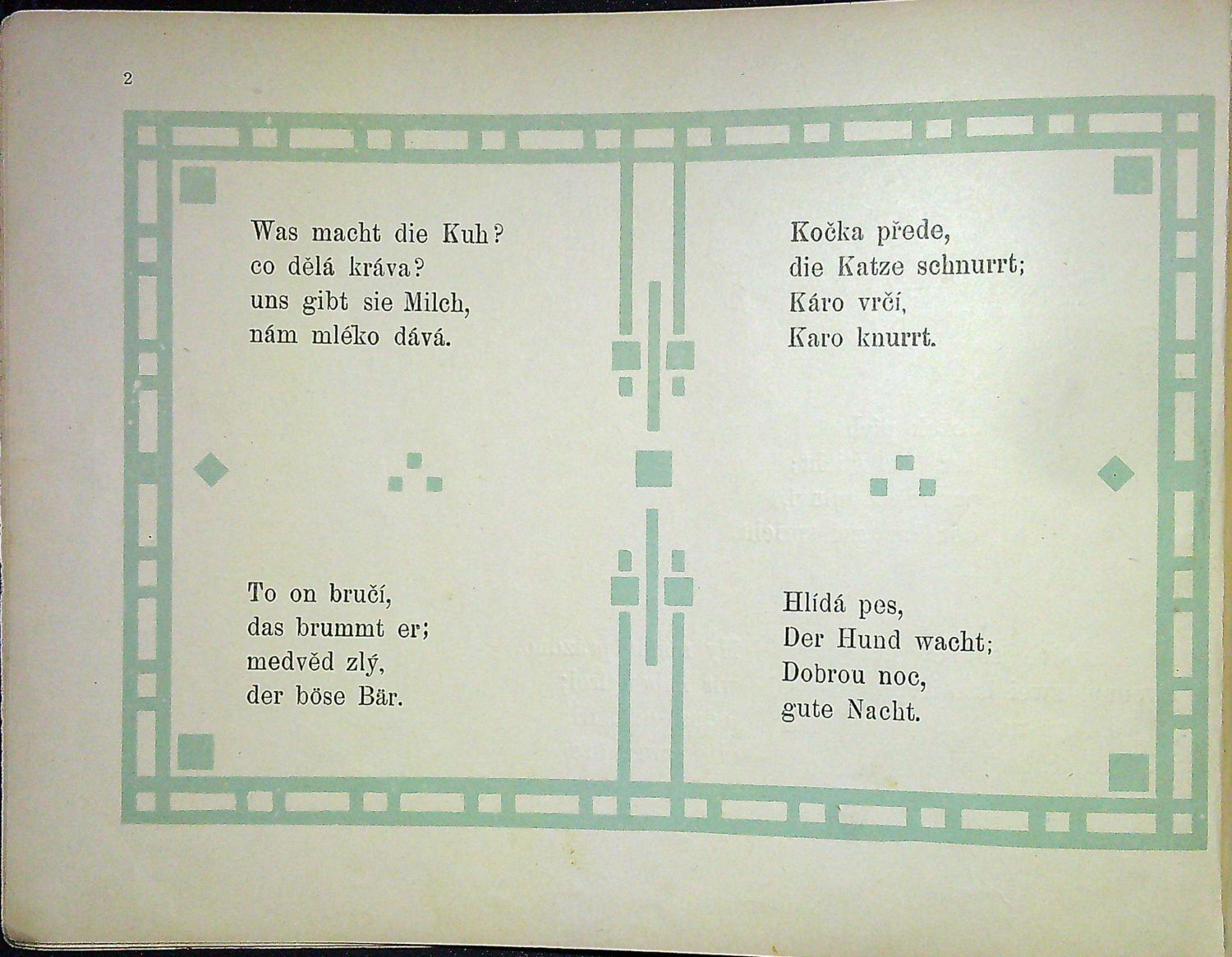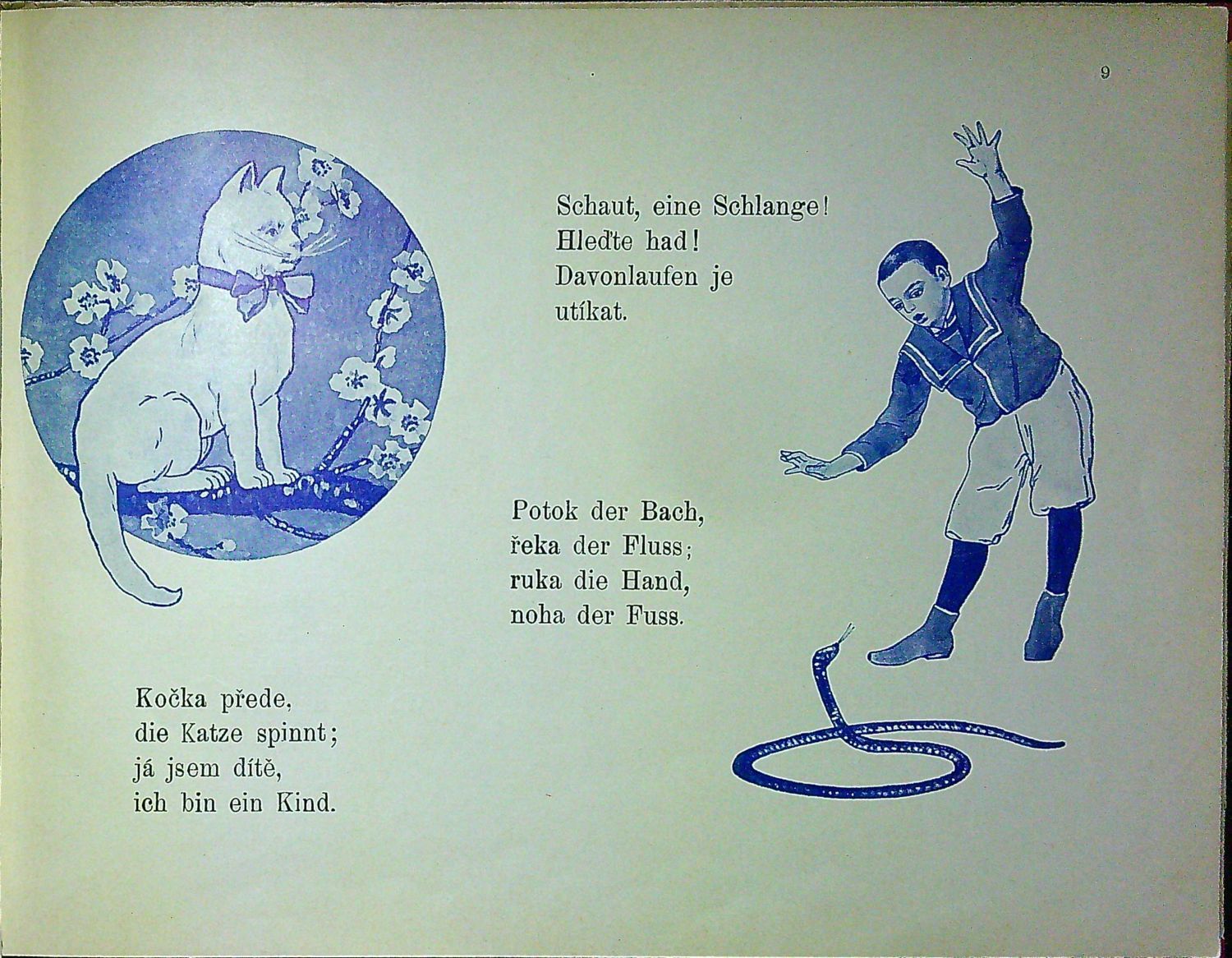 Vícebarevný tisk, titulní list a sudě paginované strany bez ilustrací v zeleně tištěném geometrickém rámu, na lichých stranách modře (temně a světle) tištěné ilustrace o F. Fr. (?). - Dobová kartonová vazba, ve hřbetu přelepená červenou plátěnou páskou, na rubu předsádky a líci vakátu modře tištěný ornamentální dekor. - Přední strana desky odpadlá.