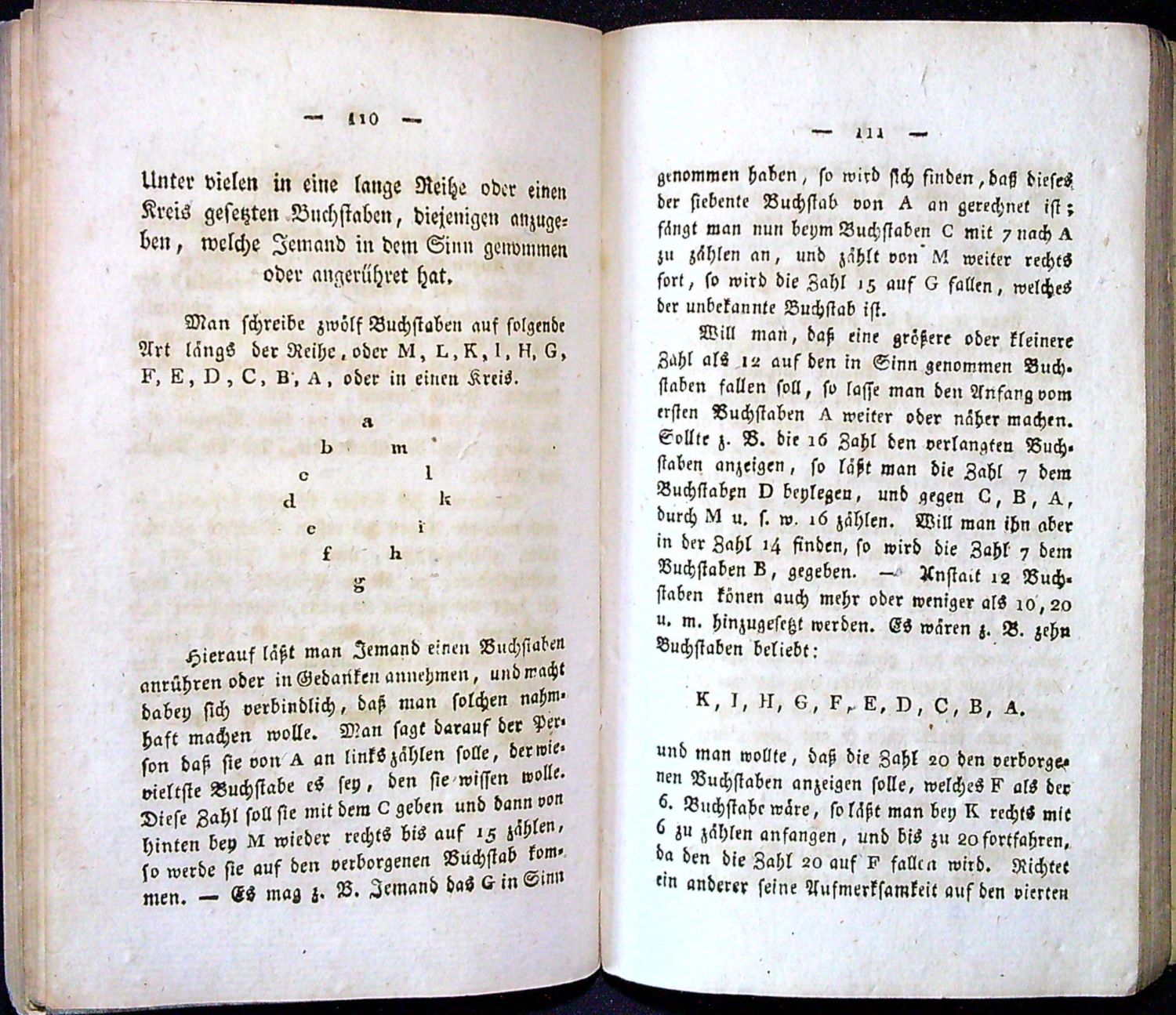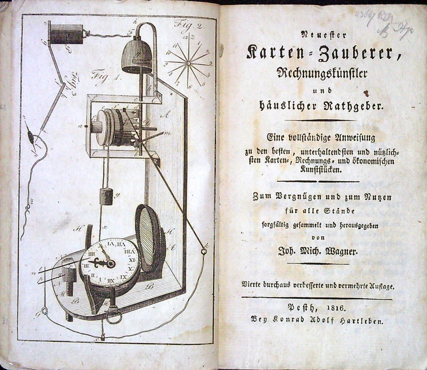 Tištěno švabachem, ve front. mědirytina, varianta titulního listu. - Nabízená kniha vyšla téhož roku jako druhý díl "Allgemeines magisches Zauberkabinet" pod názvem "Neuestes großes Zauberkabinet und Kunstmagazin", Zweyter Theil. - Dobová kartonová vazba, v rozích lehce odřená.