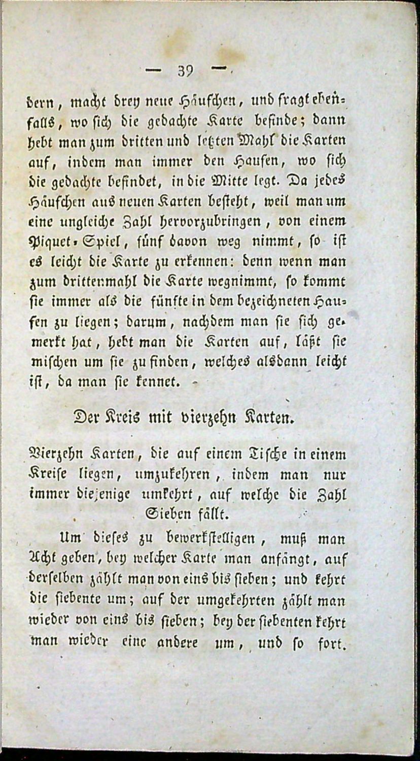 "Neuster Karten=Zauberer, Rechnungskünstler und Häuslicher Rathgeber. Eine vollständige Anweisung zu den besten, unterhaltendsten und nützlichsten Karten=, Rechnungs = und ökonomischen Kunststücken. Zum Vergnügen und zum Nutzen für alle Stände sorfältig gesammelt und herausgegeben von ......