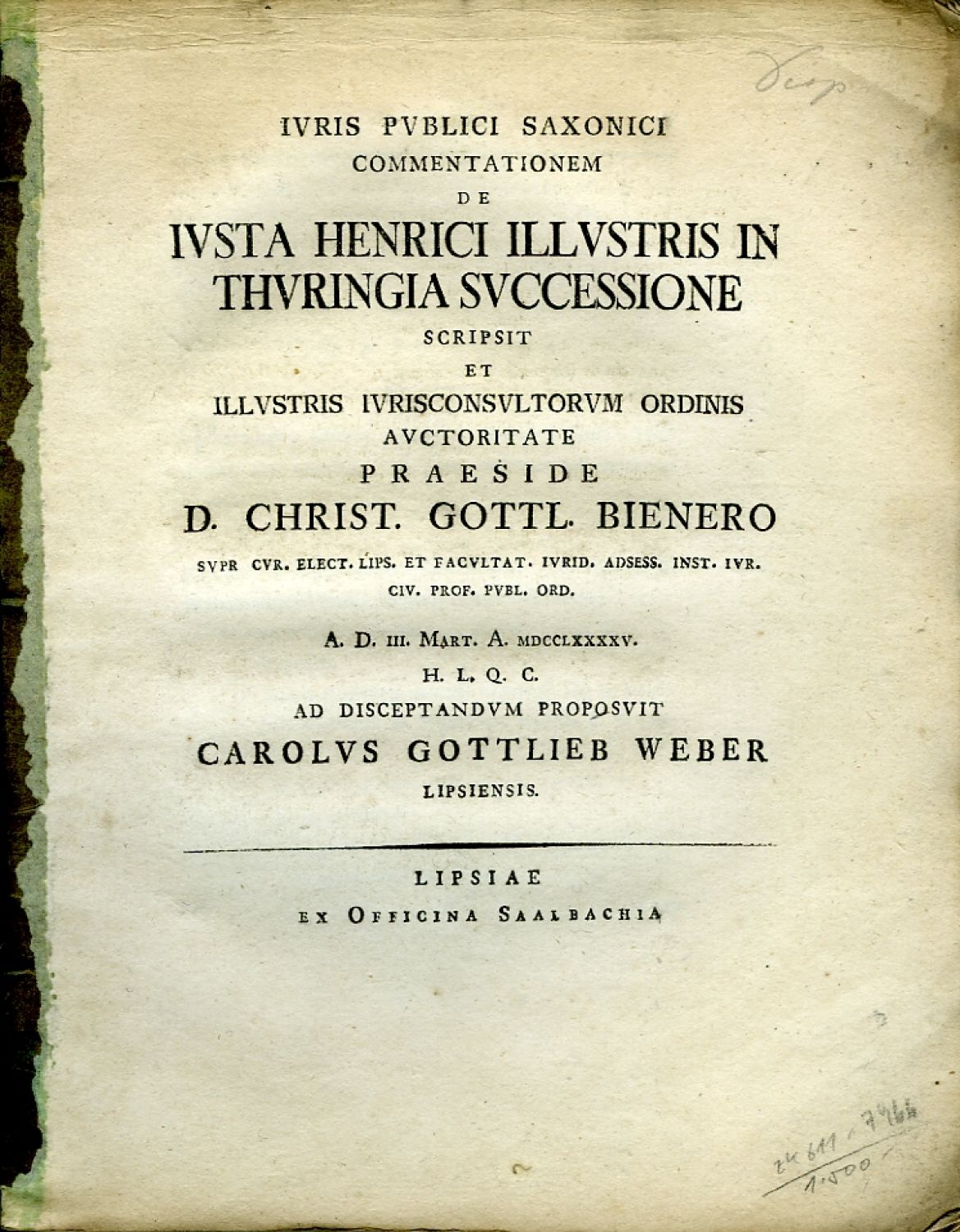 IVRIS PVBLICI SAXONICI COMMENTATIONEM DE IVSTA HENRICI ILLVSTRIS IN THVRINGIA SVCCESSIONE SCRIPSIT ET ILLVSTRIS IVRISCONSVLTORVM ORDINIS AVCTORITATE PRAESIDE D. CHRIST. GOTTL. BIENERO ... A. D. III. MART. A. MDCCLXXXXV. H. L. Q. C. AD DISCEPTANDVM PROPOSVIT ...