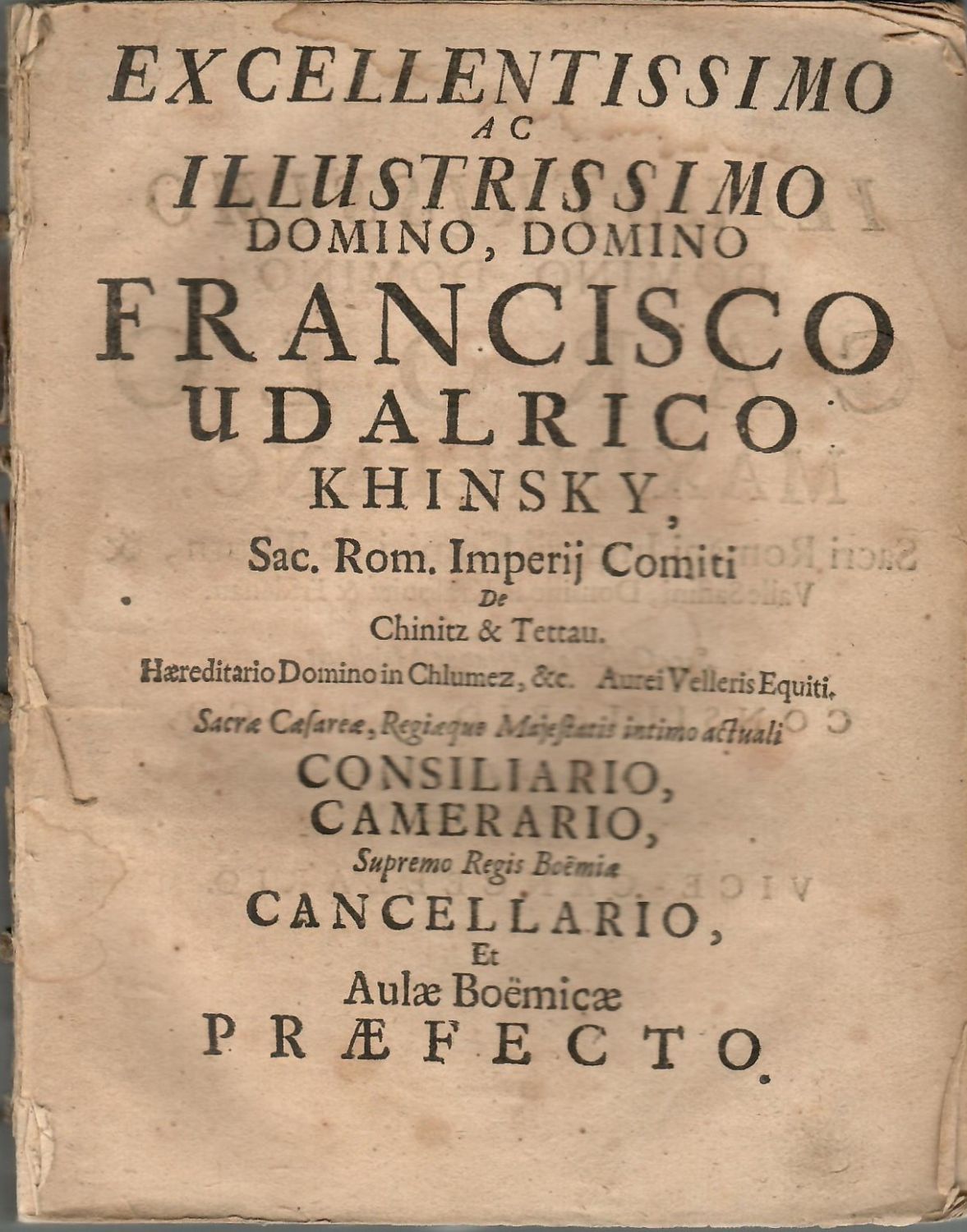 + přívazek: J. J. Weingarten "PRODROMUS REDIVIVUS SPECULI JUDICUM, SEU TRIFOLIUM PER QUOD JUDICIBUS JUSTITIA, PRUDENTIA, ET CONCORDIA, SIMILQUE DEVOTIO ET FIDELITAS ERGA AUGUSTISSIMAM DOMUM AUSTRIACAM RECOMMENDATUR". Prag, Jan Karel Jeřábek, 1690, 24 listů z 25 (chybí poslední list F-4). Tištěno švabachem, latinský text antikvou. Plné iniciály propletené úponky zalomené do výše 4 řádků, vstupní pásový vlys z ornamentů. (Pumprla X,5044; BCBT 41589). Papír zahnědlý, místy světlé mapy od vlhkosti, poslední dva listy přívazku odpadlé od knižního bloku, list A-2 přívazku při spodním vnějším okraji utržený (bez zásahu do textu).