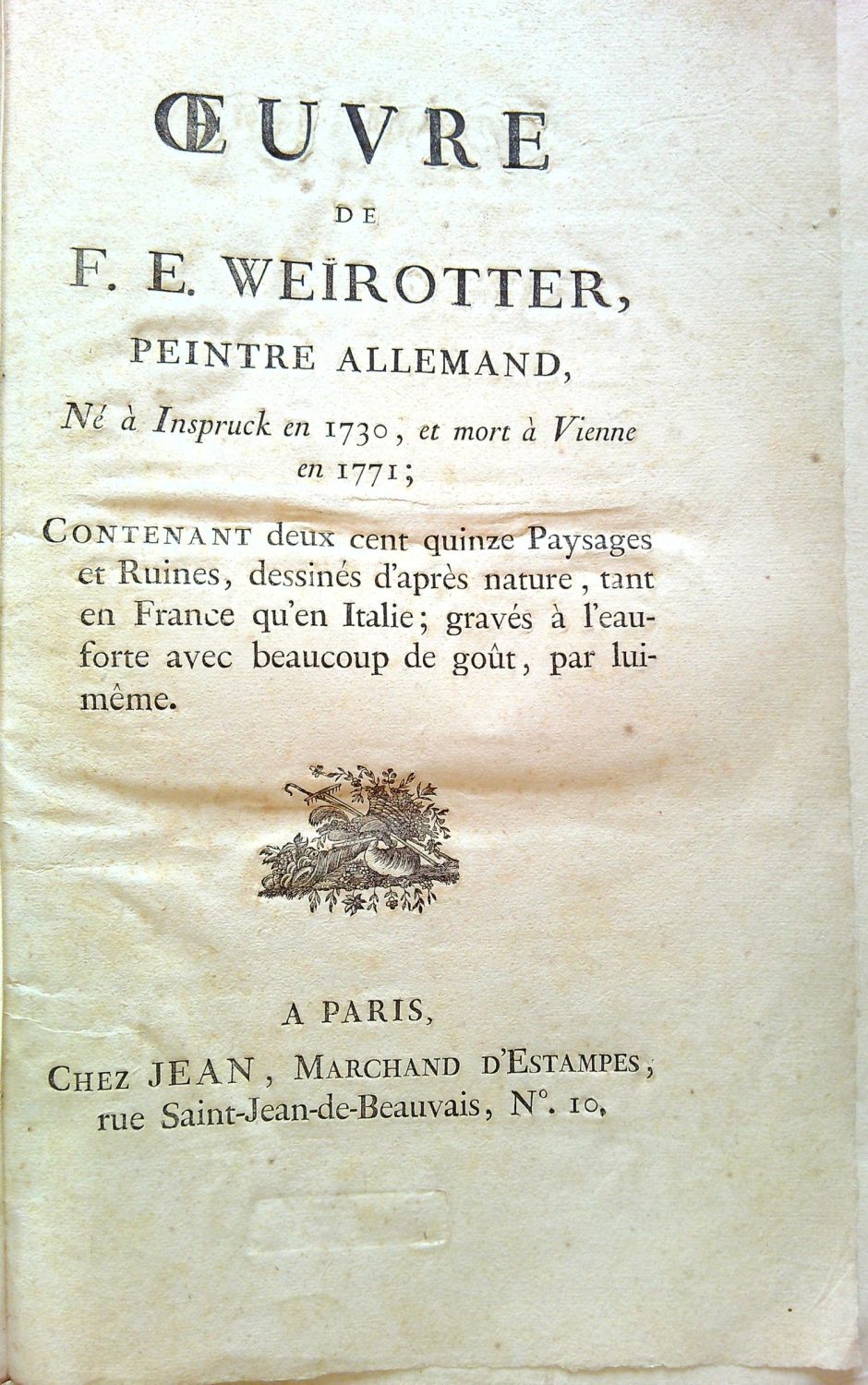 OEUVRE DE F. E. WEIROTTER, PEINTRE ALLEMAND, Né a Inspruck en 1730, et mort á Vienne en 1771; Contenant deux cent quinze Paysages et Ruines, desinnés d´asprés nature, tant en France qu´en Italie; gravés a l´eauforte avec beaucoup de gout, par luimeme.
