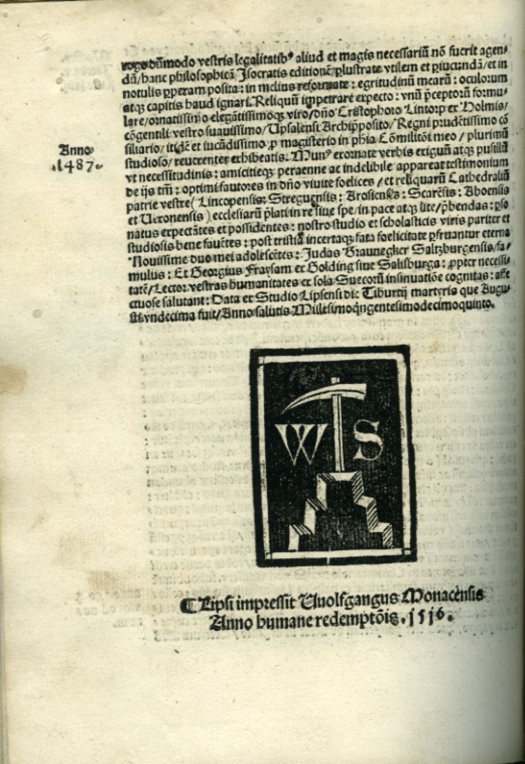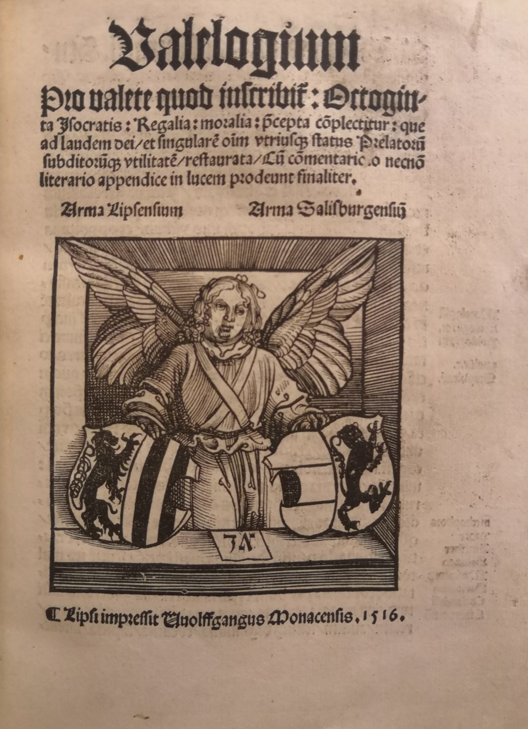 Valelogium Pro valete quod inscribit[ur]: Octoginta Jsocratis: Regalia: moralia: p[rae]cepta co[m]plectitur: que ad laudem dei/ et singulare[m] o[l]im vtrius[que] status Prelatoru[m] subditoru[mque] vtilitate[m]/ restaurata/ Cu[m] com[m]entariolo necno[n] literario appendice in lucem prodeunt finaliter. Arma Lipsensium Arma Saltzburgensiu[m].