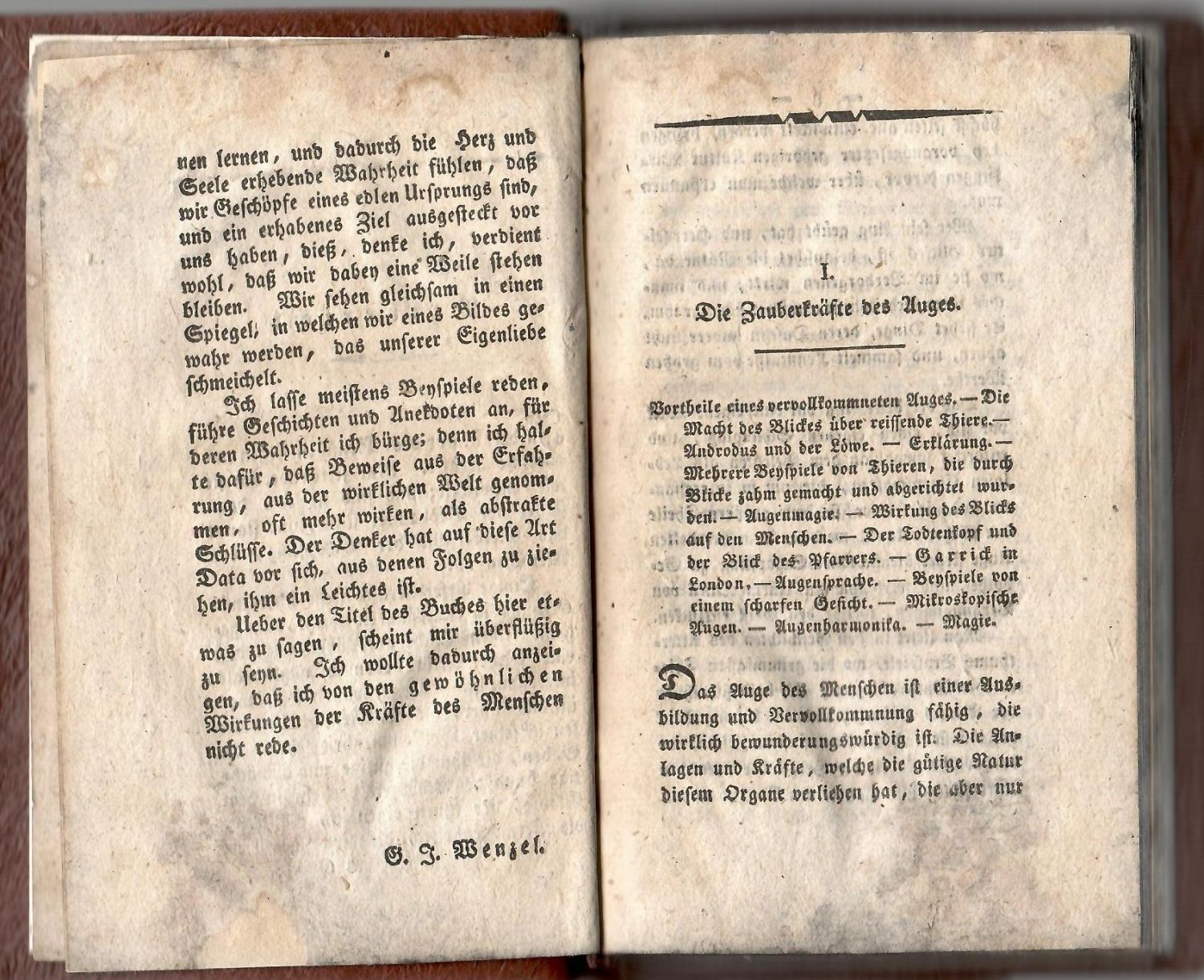 Tištěno švabachem, tučně tištěné versálky, poznámky pod čarou, ozdobné linky a tyče, ve front. alegor. mědirytina sign. F. Weber, pod ní nápis "Der Mensch das Meisterstück der Schöpfung" (Člověk je mistrným dílem stvoření).