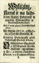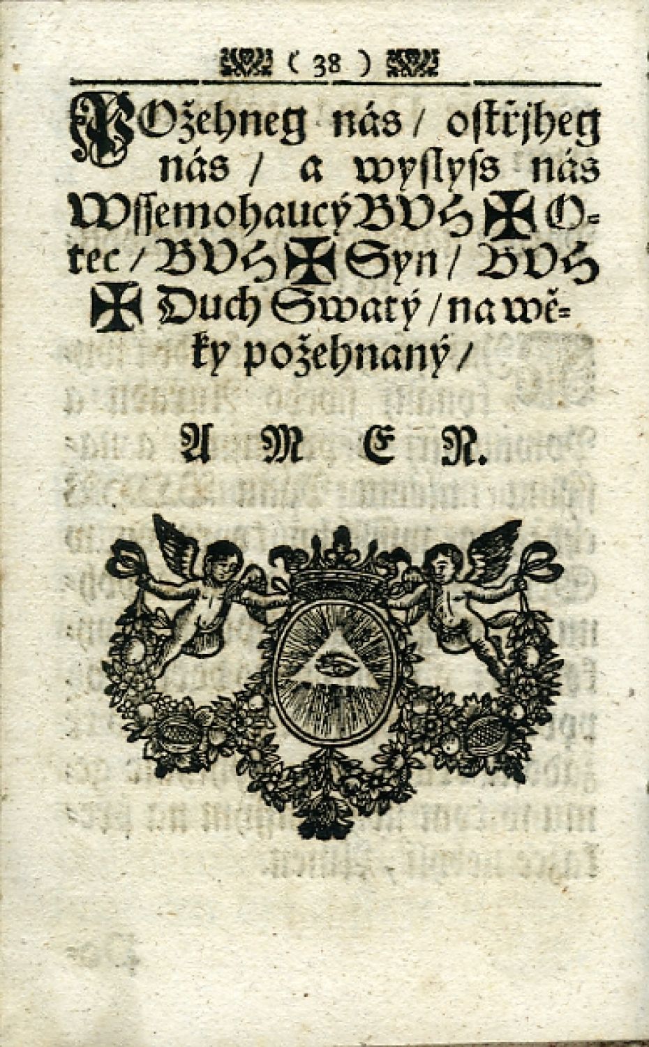 Knihopis 16.711. - Bez titulního listu (nebyl vytištěn), koncová barokní dřevořezová viněta, plné iniciálky propletené úponky zalomené do výše 2-3 řádků, arabská paginace stran uprostřed horního okraje v kulatých závorkách mezi drobnými tiskařskými ozdůbkami, od sazby oddělená jednoduchou linkou. - Dobová kartonová vazba potažená škrobovým papírem. Okraje zadní desky zahnědlé, hřbet odřený, listy čisté.