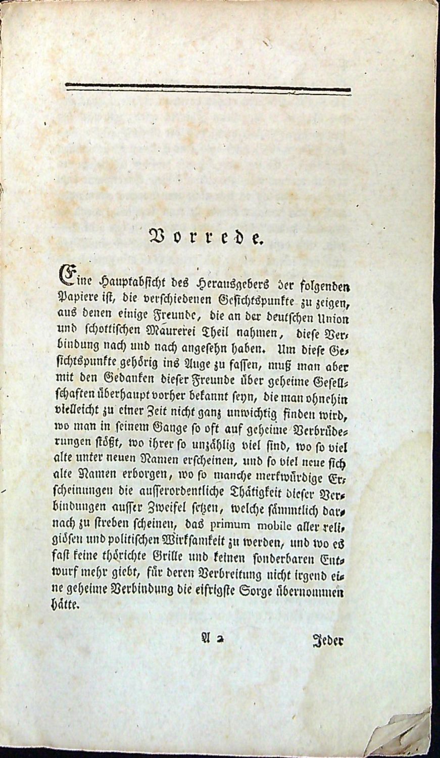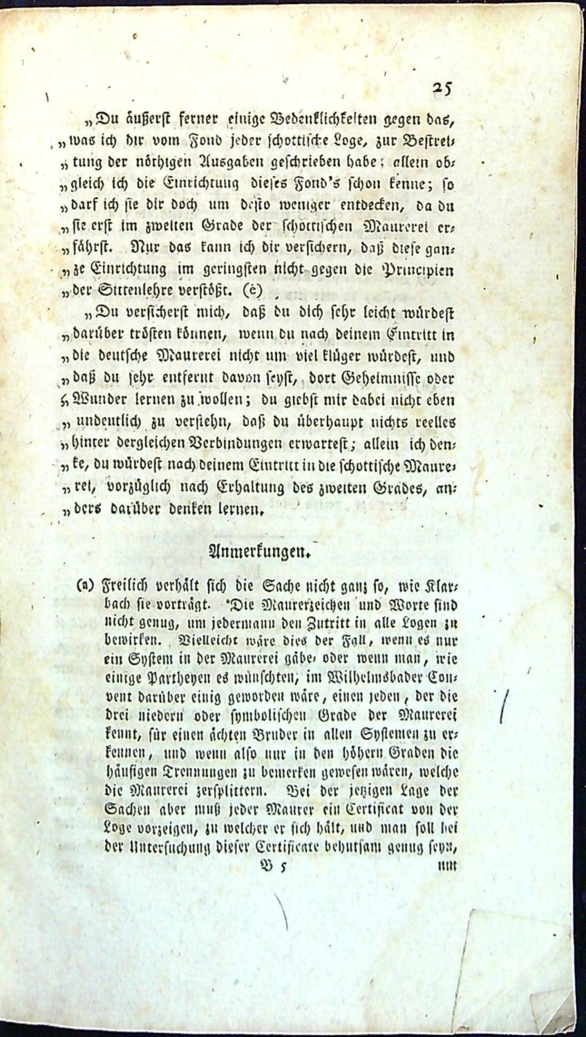 Tištěno švabachem, tištěné poznámky pod čarou, mizící linky. - Dobová pap. obálka z tragantového papíru, místy vybledlá, ve hřbetu z větší části chybí papírový pokryv, přes hřbet přelepeny dva staré pap. knih. štítky s čísly, přední strana obálky při horním okraji hřbetu natržená, oslí uší, při spodním vnějším okraji stran světle hnědé mapy způsobené vlhkostí. Na tit. listu staré razítko zednářské lóže "Archiv und Bibliothek d. (Loge) Carl zur gekrönten Säule Braunschweig".