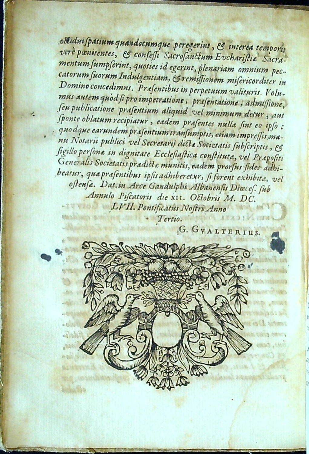 Titulní list versálkami, impresum oddělené jednoduchou linkou, latinský text antikvou, živá záhlaví, signatury.