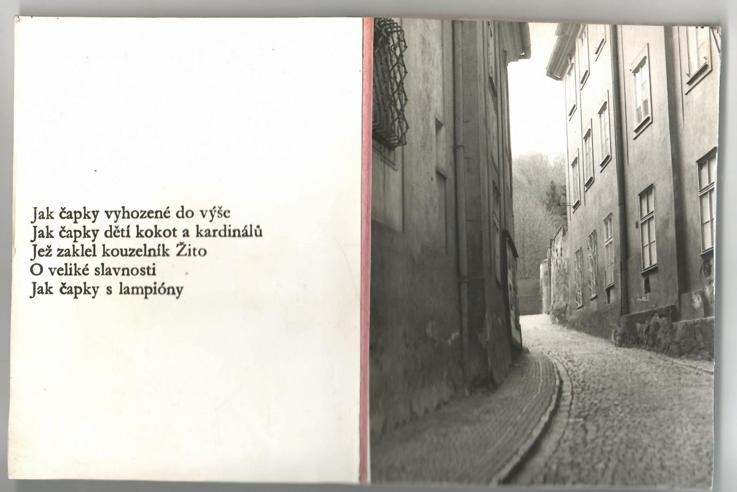 Původní autorský, vlastním nákladem vydaný samizdatový tisk. Šest listů růžového kartonu z obou stran potažených původními fotografiemi pražských zákoutí s Nezvalovým textem, snad fotograficky reprodukovaným (na líci prvního listu název, na rubu text, na líci i rubu posledního listu fotografie).