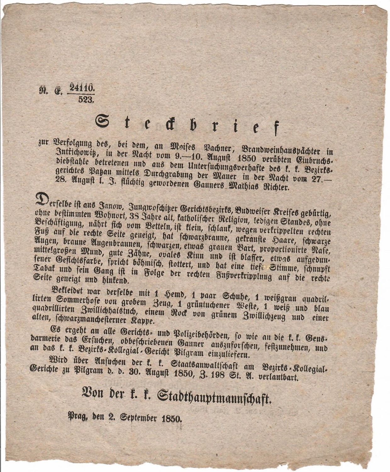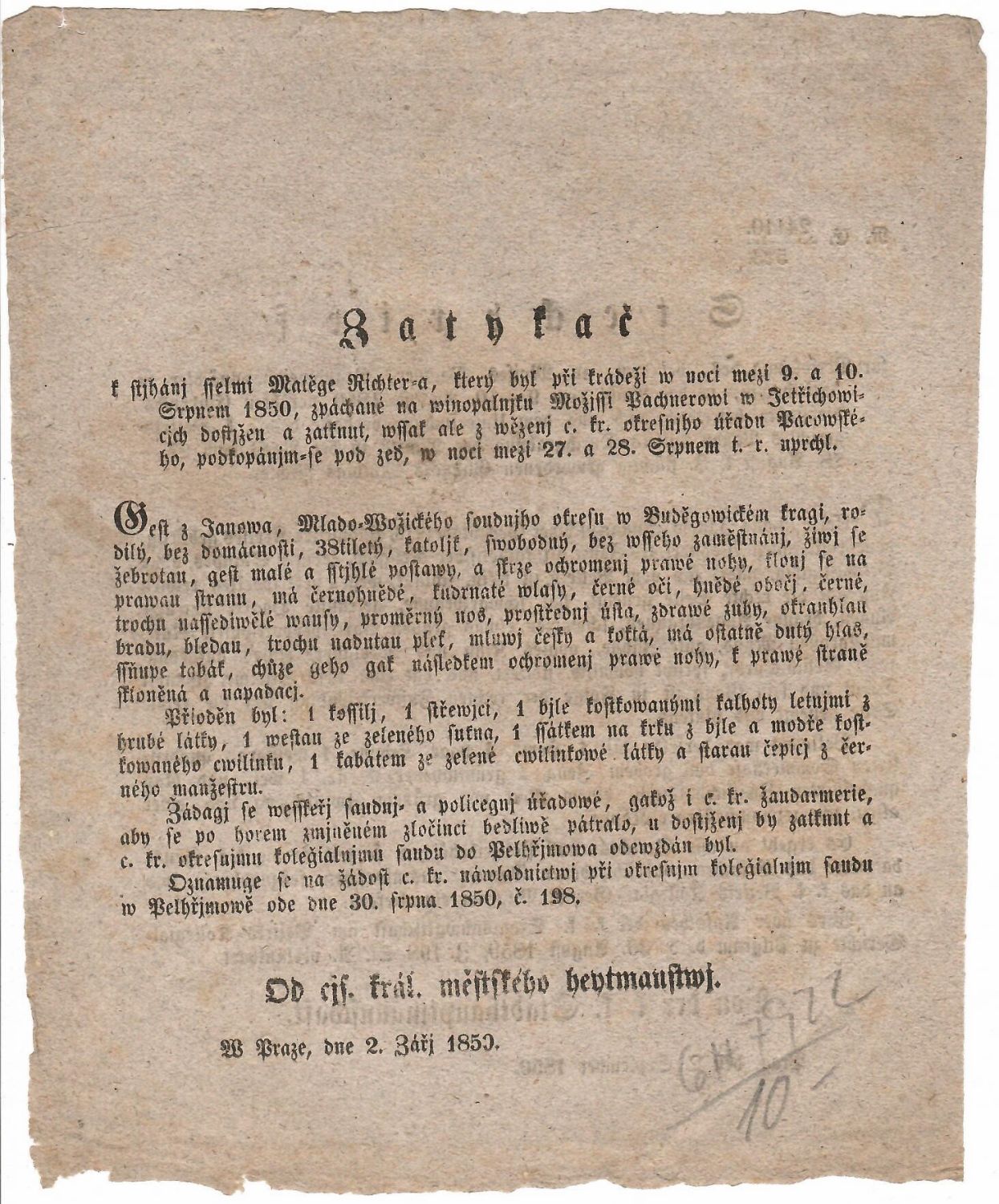Zatykač k stjhánj Matěge Richter=a, který byl při krádeži w noci mezi 9. a 10. Srpnem 1850, zpáchané na winopalnjku Možjssi Pachnerowi w Jetřichowicjch dostjžen a zatknut, wssak ale z wězenj c. kr. okresnjho úřadu Pacowského, podkopánjm=se pod zeď, w noci mezi 27. a 28. Srpnem t. r. uprchl.