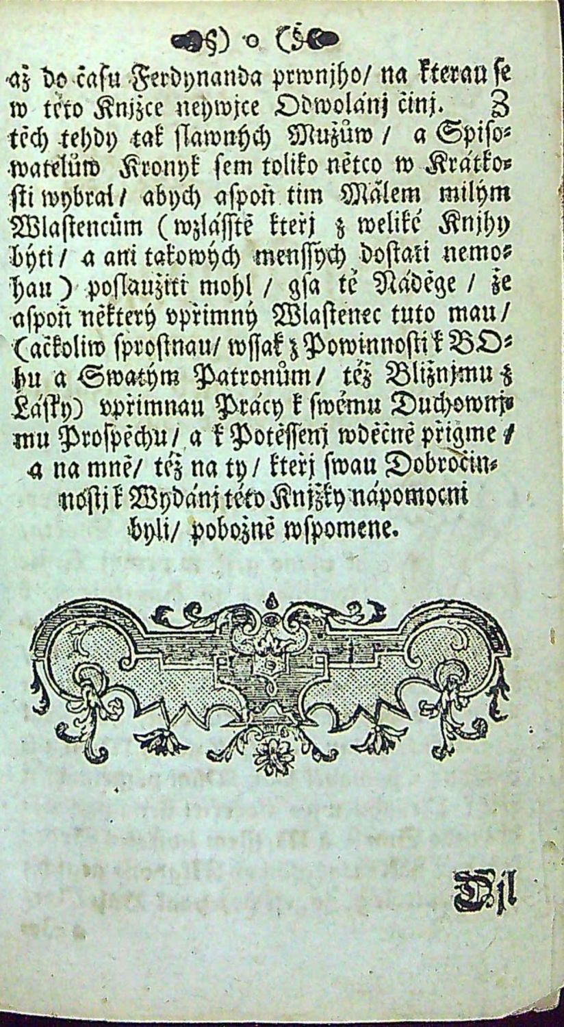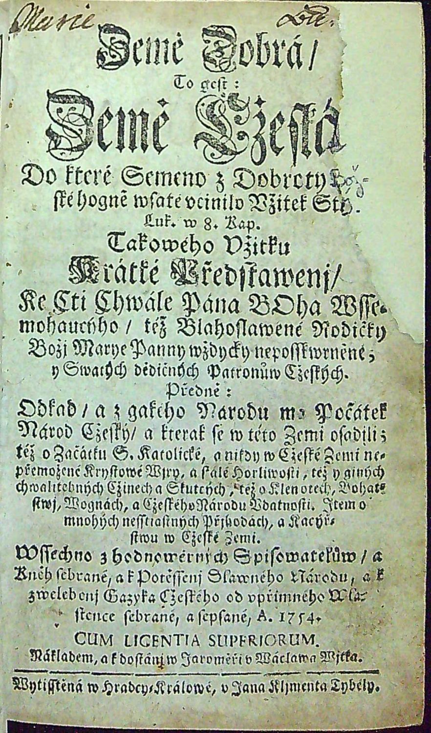 Země Dobrá / To gest: Země Cžeská, Do které Semeno z Dobroty Bož=ské hogně wsaté učinilo Užitek Stý. Luk. w 8. Kap. Takowého Užitku Krátké Předstawenj / Ke Cti Chwále Pána BOha Wsse=mohaucýho / též Blahoslawené Rodičky Božj Marye Panny wždycky neposskwrněné; y Swatých dědičných Patronůw Cžeských. Předně: Odkad / a z gakého Narodu ma Počátek Národ Cžeský / a kterak se w této Zemi usadili; též o Začátku S. katolické, a nikdy w Cžeské Zemi ne=přemožené Krystowé Wjry, a stálé horliwosti, též o giných chwalitebných Cžinech a Skutcých, též o Klenotech, Bohat=stwj, Wognách, a Cžeského národu Udatnosti. Item o mnohých nesstiastných Přjhodách, a Kacýř=stwu w Cžeské Zemi. Wssechno z hodnowěrných Spisowatelůw / a Kněh sebrané, a k potěssenj Slawného Národu, a k zwelebenj Gazyka Cžeského od upřímného Wla=stence sebrané a sepsané. A. 1754.