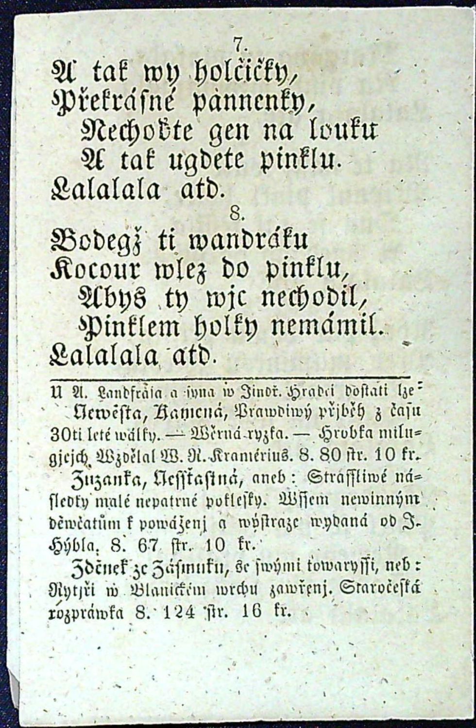 Tištěno švabachem, osm arabsky číslovaných strof. Na tit. listu dřevorytová viněta.