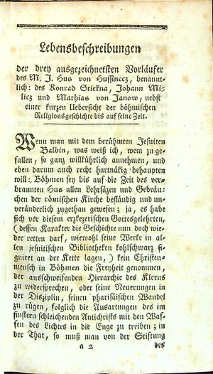 Lebensbeschreibungen der drey ausgezeichnetsten Vorläuser des berühmten M. Johannes Hus von Hussinecz, benanntlich: des Konrad Stiekna, Johannes Milicz und Mathias von Janow; nebst einer kurzen Uebersicht der böhmischen Religionsgeschichte bis auf seine Zeit.