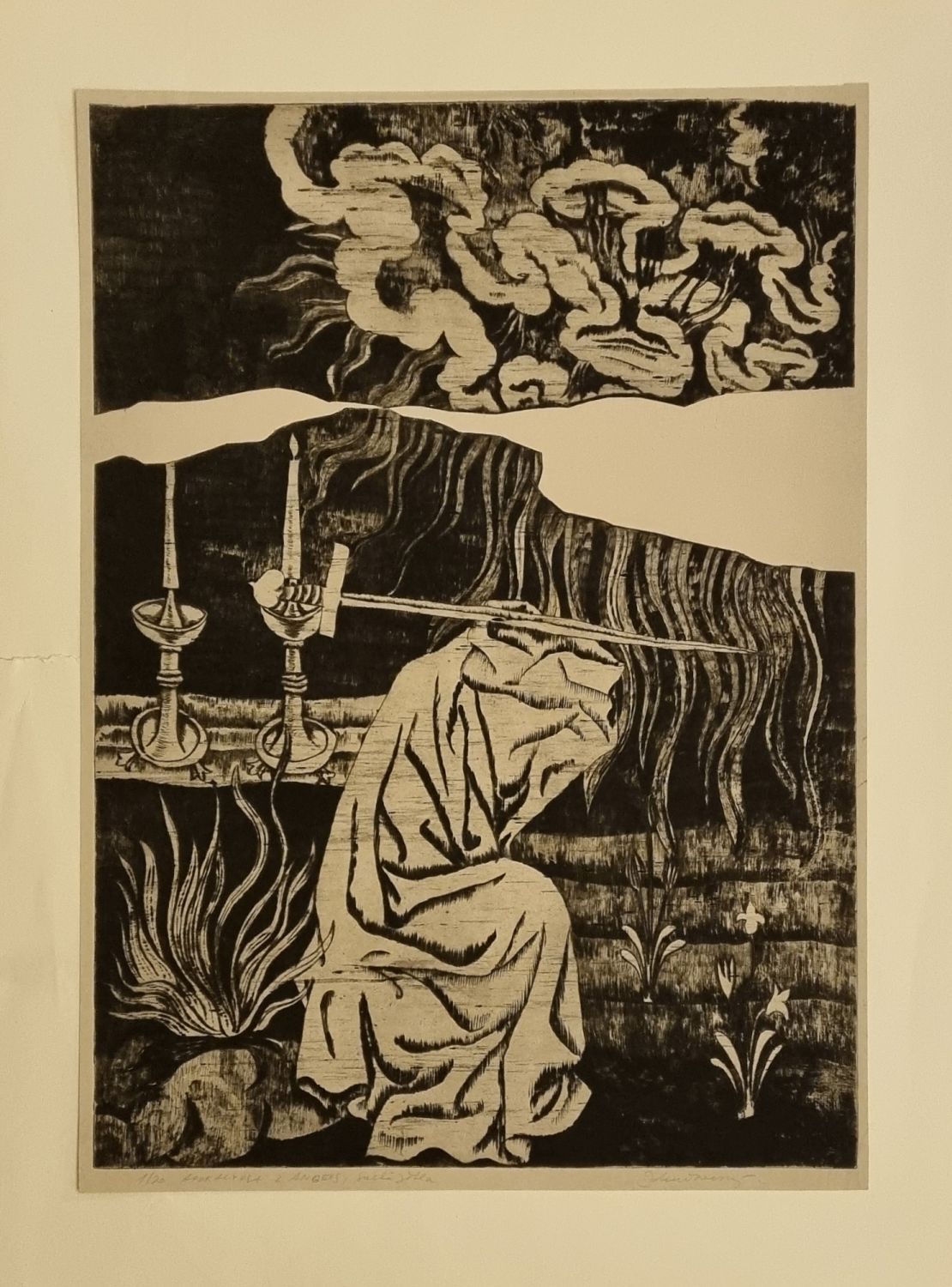 Suchá jehla, vpravo dole autorem tužkou podepsaná, vlevo dole číslo tisku 1/20, název díla a technika. Volný list.
