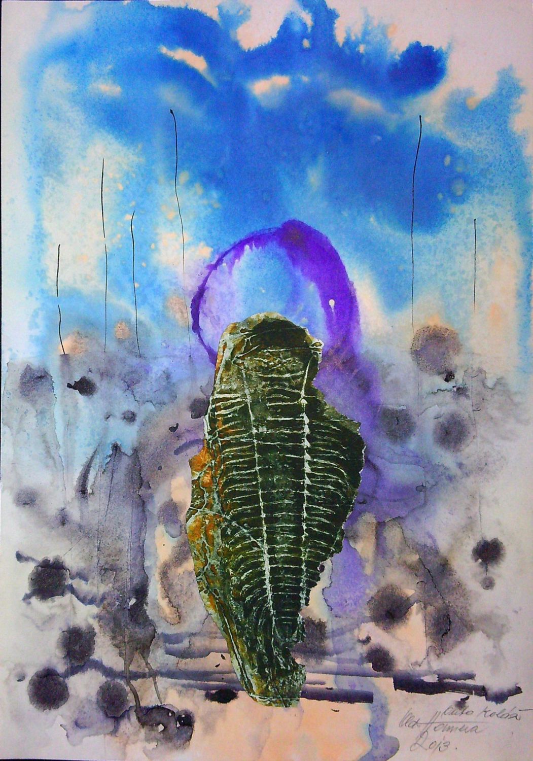 Lavírovaná malba akvarelem a tuší kombinovaná s koláží, volný list vpravo dole autorem tužkou podepsaný a datovaný.