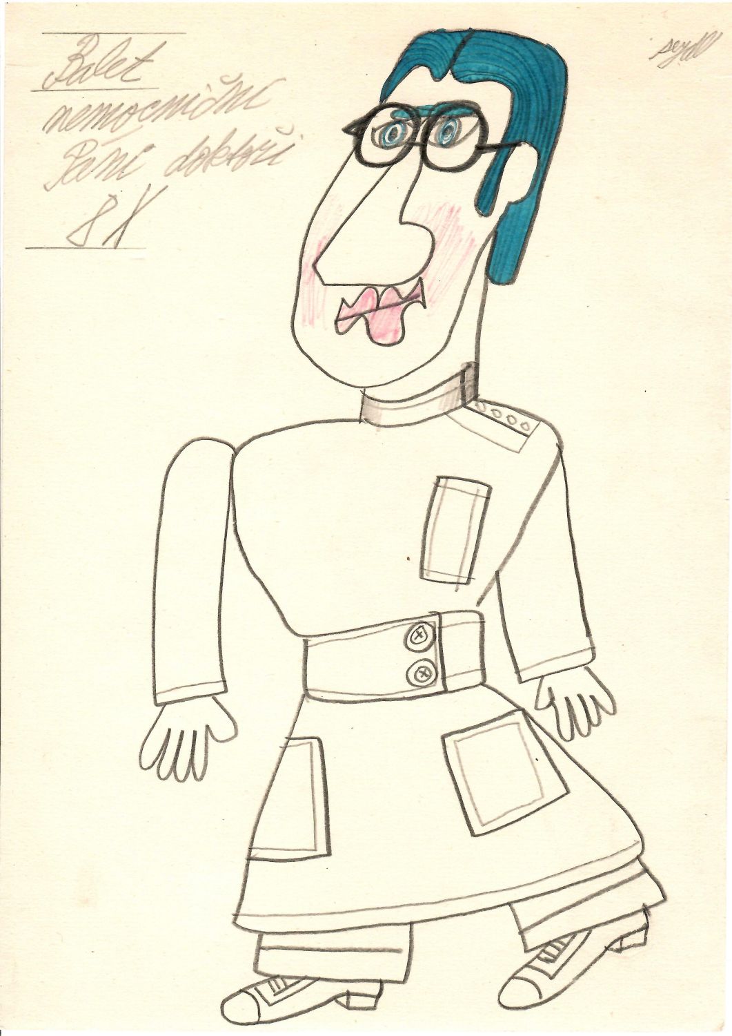 Kresba tužkou, kolorováno modrou a růžovou fixou. Volný list o rozměru 296 x 209 mm. V pravém horním rohu autorem tužkou signováno.