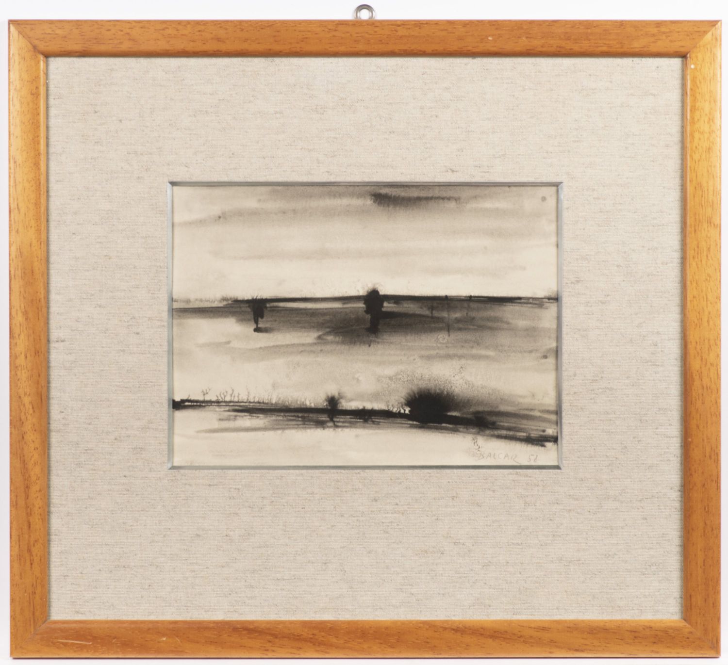 Lavírovaná kresba tuší z roku 1958 o rozměru 170 x 235 mm, autorem tužkou signovaná a datovaná vpravo dole. Zarámováno ve světlém rámu (390 x 435 mm) s antireflexivním sklem v hluboké plátěné paspartě s výřezem stříbrné barvy.