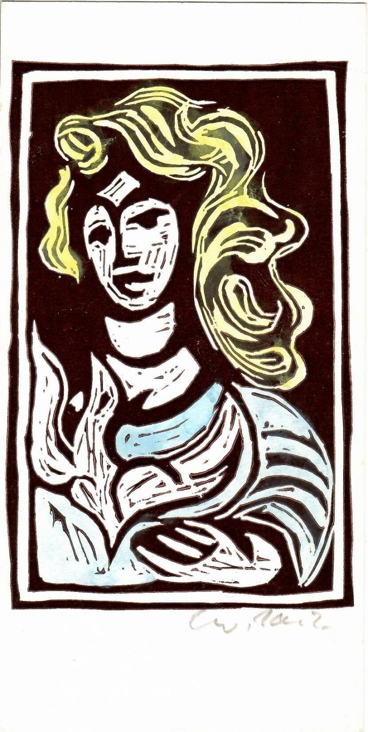 Linoryt autorem ručně kolorovaný o rozměru tisku 157 x 100 mm. Při pravém spodním okraji tisku autorem tužkou signováno.