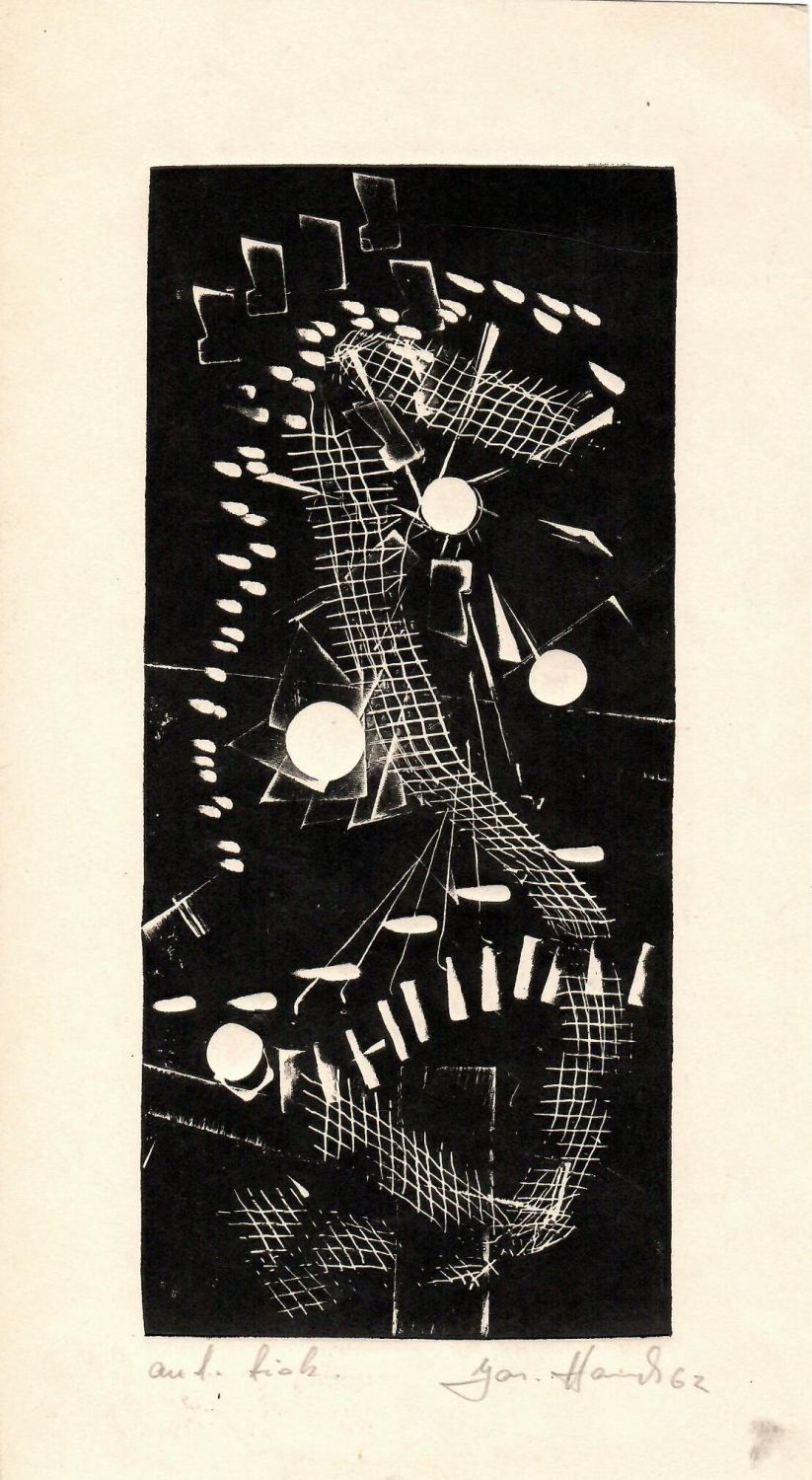 Linoryt kombinovaný se strukturální grafikou. Volný list. Při spodním okraji tisku autorem tužkou připsáno "aut. tisk", signováno a datováno.