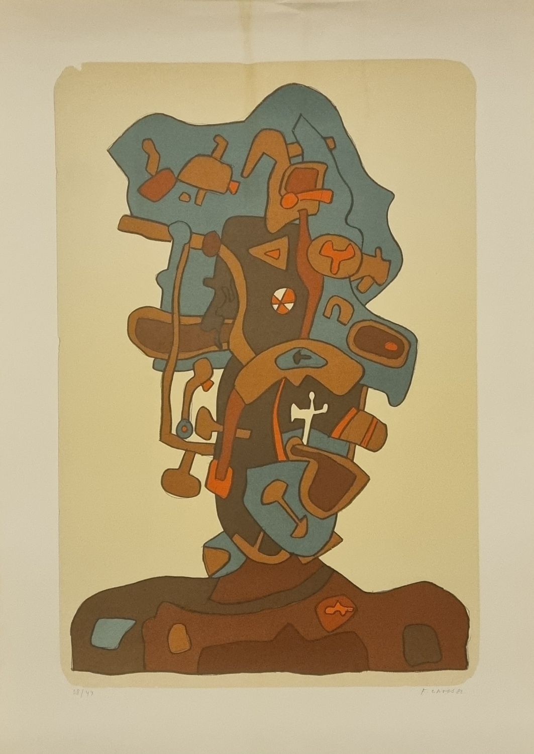 Barevná litografie vpravo dole autorem tužkou podepsaná a datovaná, vlevo dole číslo tisku 38/44, volný list. Papír při horním okraji uprostřed lehce pomačkaný a uprostřed od horního okraje v délce cca 10 cm světle hnědá šmouha.