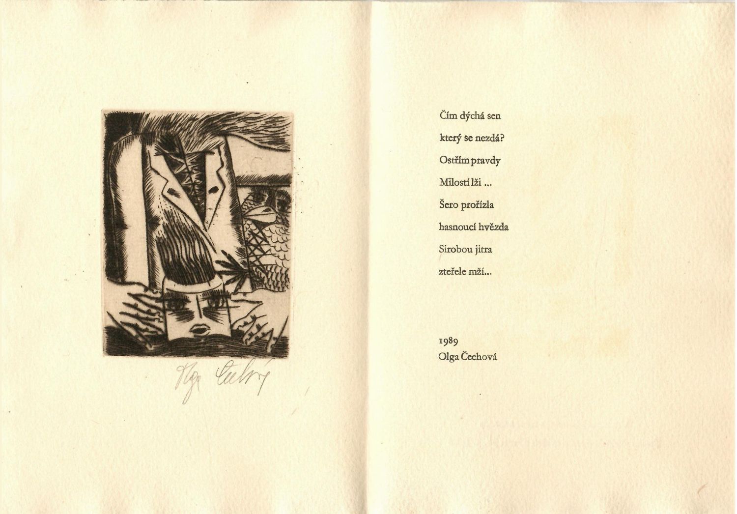 Suchá jehla, autorkou při spodním okraji tisku tužkou podepsaná. Grafika na složeném listu s básní. Věnováno účastníkům valné hromady Spolku sběratelů a přátel exlibris v Praze 31. 3. 1990. Složený list.