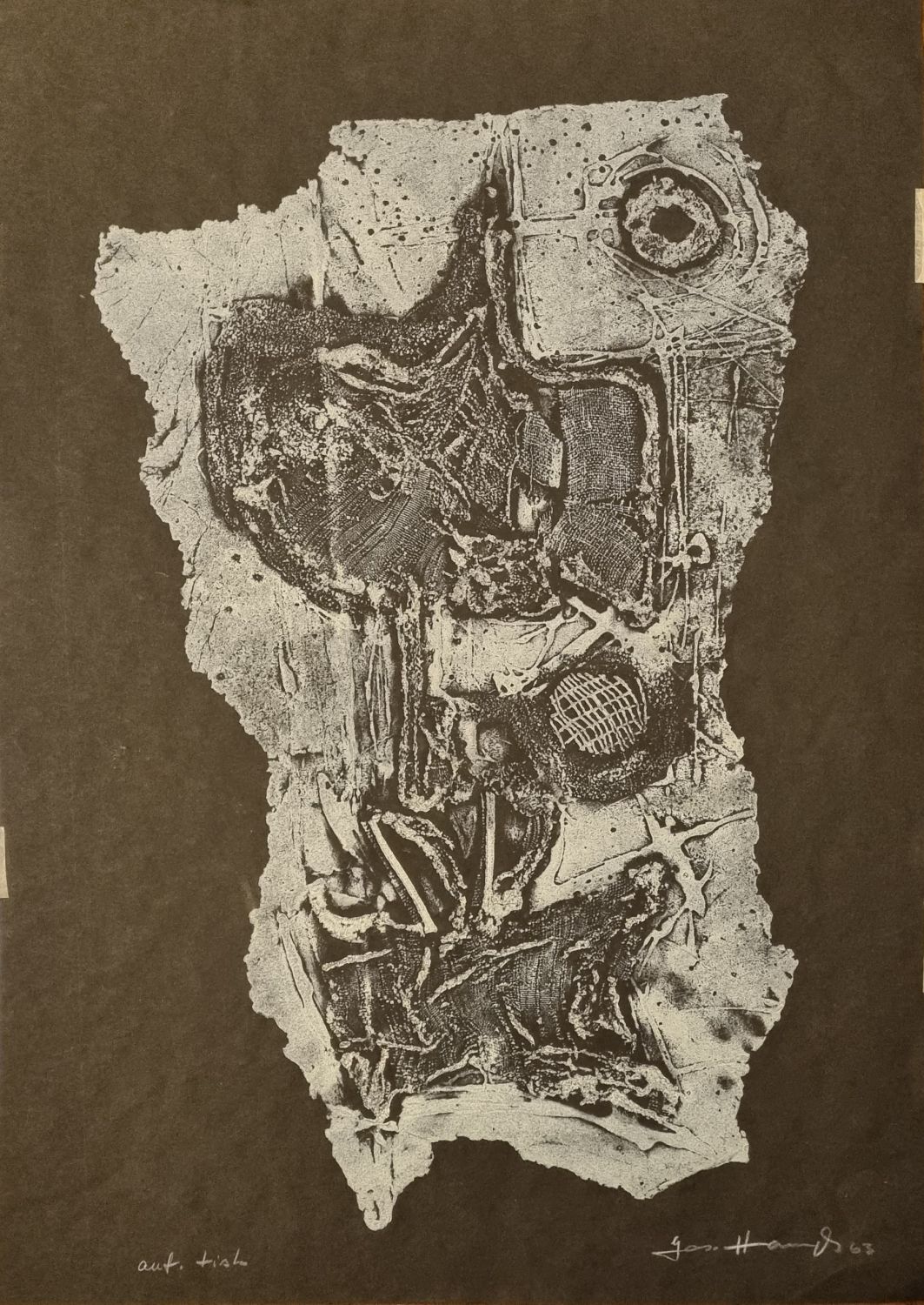 Strukturální grafika tištěná na černém papíře, vpravo dole autorem tužkou podepsaná a datovaná, vlevo dole autorem tužkou napsáno "autorský tisk".