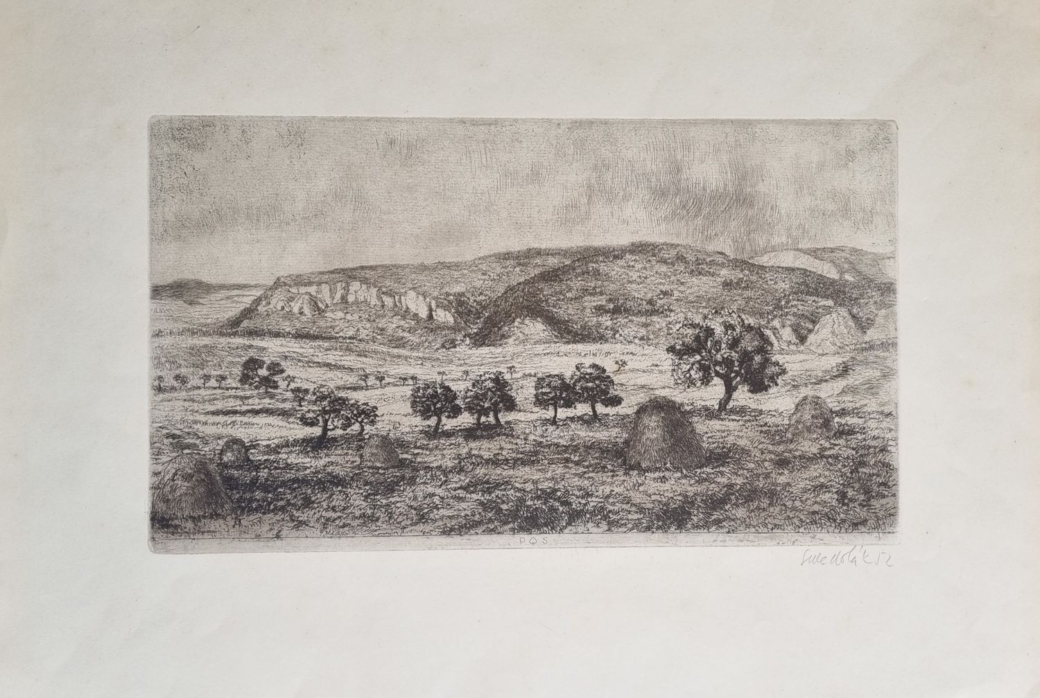 Lept, autorem při pravém spodním okraji tisku tužkou signováno a datováno. Na listu místy nepatrné světle hnědé flíčky, nezasahuje do grafiky. Volný list.