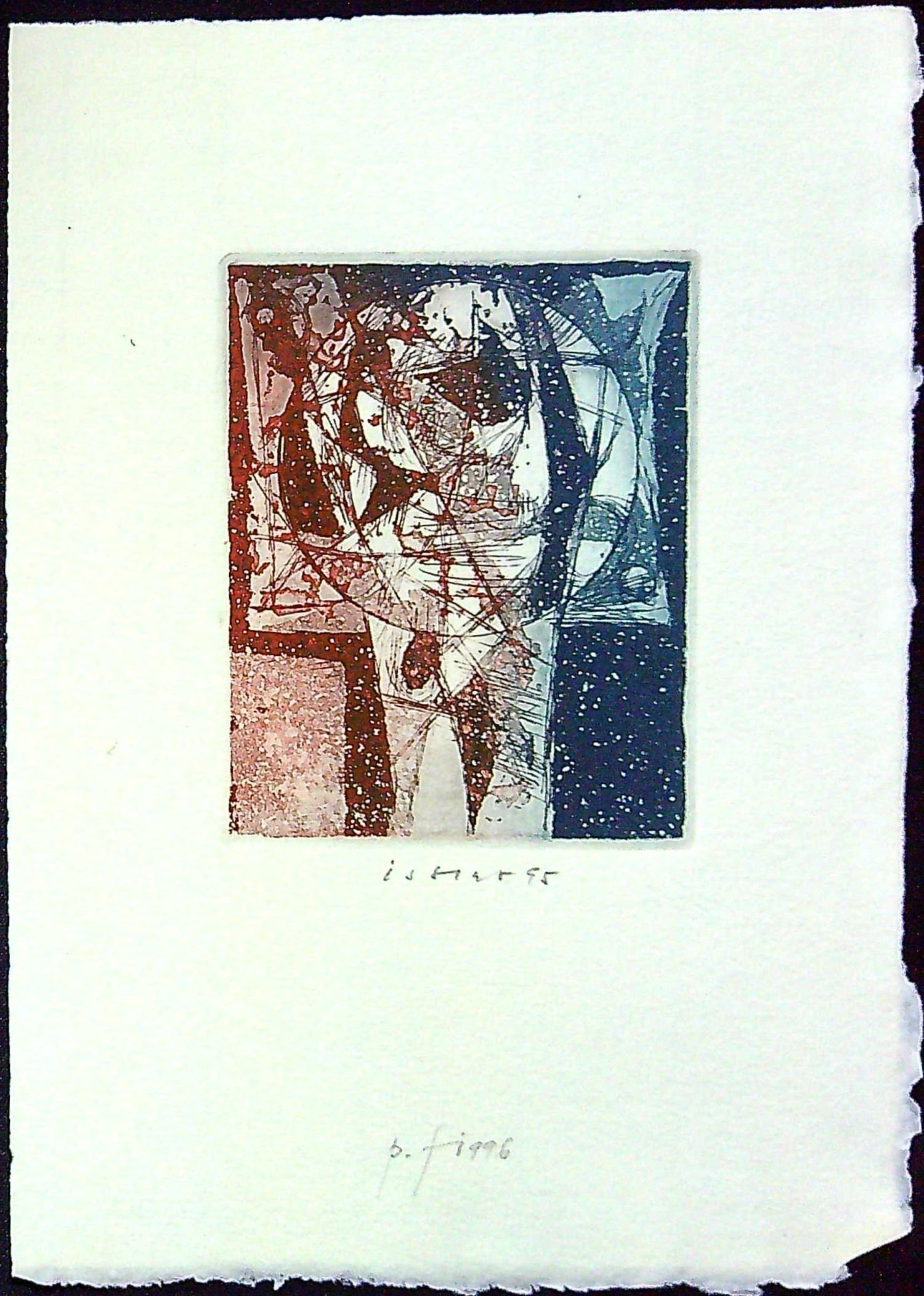 Barevný lept autorem uprostřed dole pod deskou tužkou podepsaný a datovaný, uprostřed dole autorem tužkou připsáno P.F- 1996, volný list.