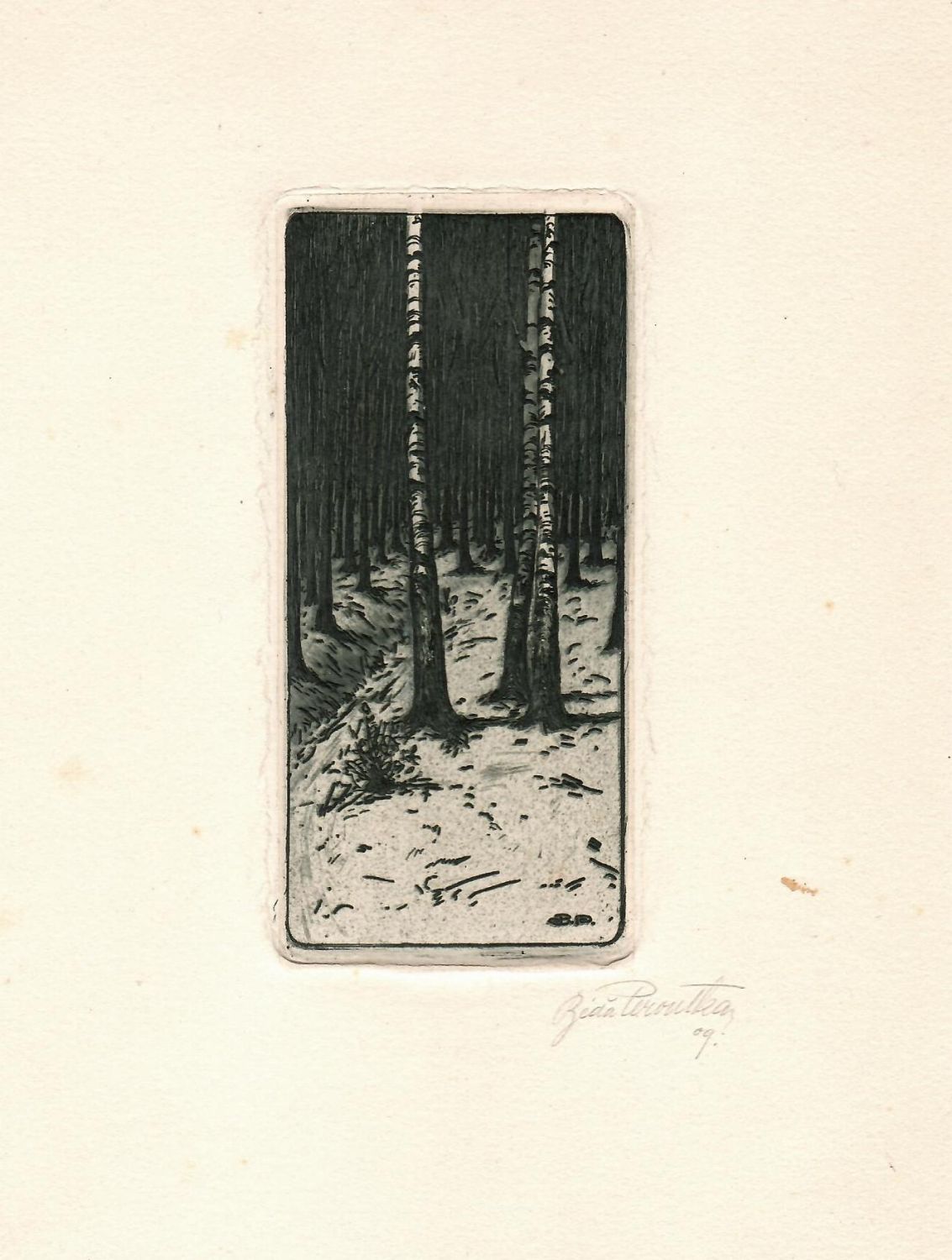 Lept o rozměru tisku 137 x 65 mm. Tisk je autorem vlepen a vmáčknut do silného podkladového papíru. Při pravém spodním okraji tisku tužkou signováno a datováno. Místy světle hnědé flíčky, které nezasahují do grafiky. Levý spodní růžek podkladového papíru ohnut.