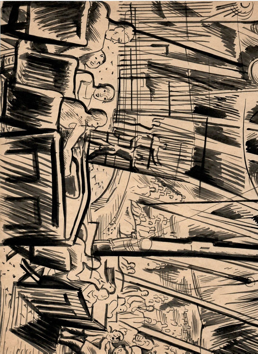 Kresba tuší, nesignováno. Na zadní straně listu kulaté razítko s textem "Z pozůstalosti akademického malíře Svatopluka Máchala". Při horním okraji zadní strany listu šetrně přelepeny drobné trhliny papíru. Pravý horní růžek listu lehce ohnut, list při horním okraji lehce pomačkán. Volný list.