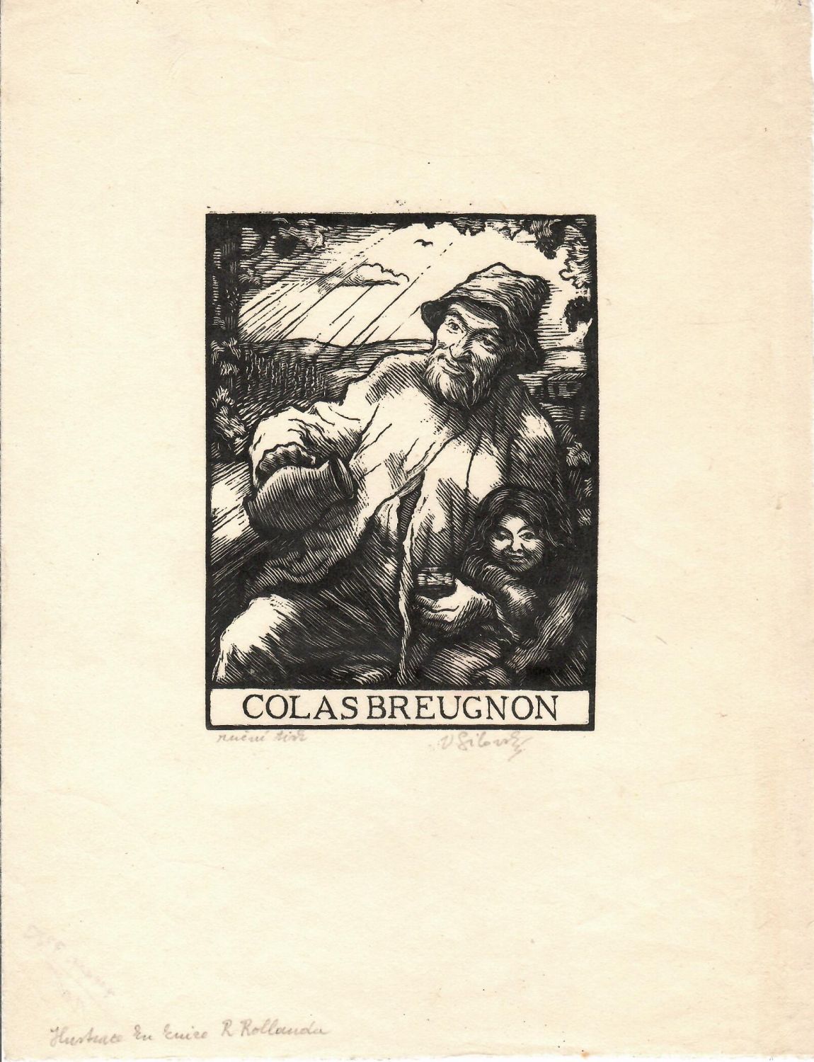 Dřevoryt, při spodním okraji tisku autorem tužkou signovaný a připsáno "ruční tisk". Ilustrace ke knize R. Rollanda. Volný list.