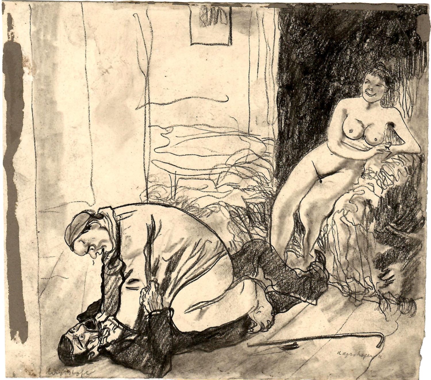 Kresba uhlem, volný list o rozměru 168 x 190 mm. Při levém a horním okraji přilepeny zbytky tmavého papíru (patrně stopy po předchozí adjustaci). Kresba tužkou signována v levém i pravém spodním rohu.
