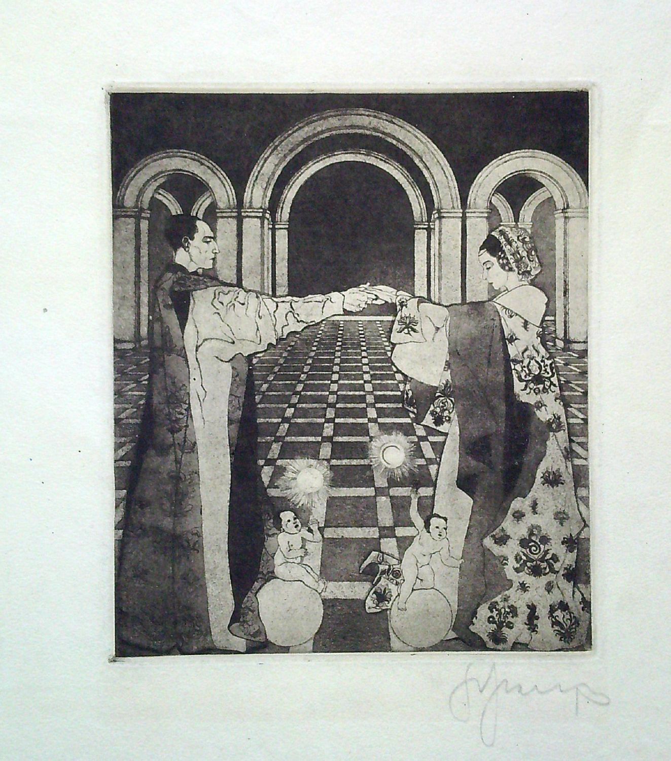 Akvatinta vpravo dole pod deskou autorem tužkou podepsaná, volný list při horních okrajích papíru pap. štítkem přichycen k paspartě.