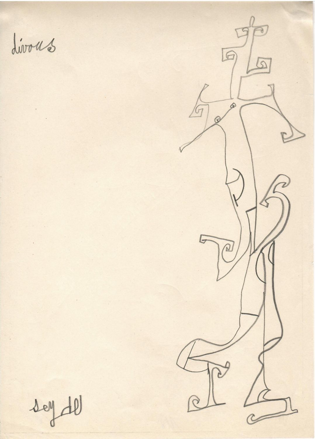 Kresba tužkou. V levém spodním rohu autorem tužkou signována. Na zadní straně v obou horních rozích zbytky lepící pásky po předchozí adjustaci.