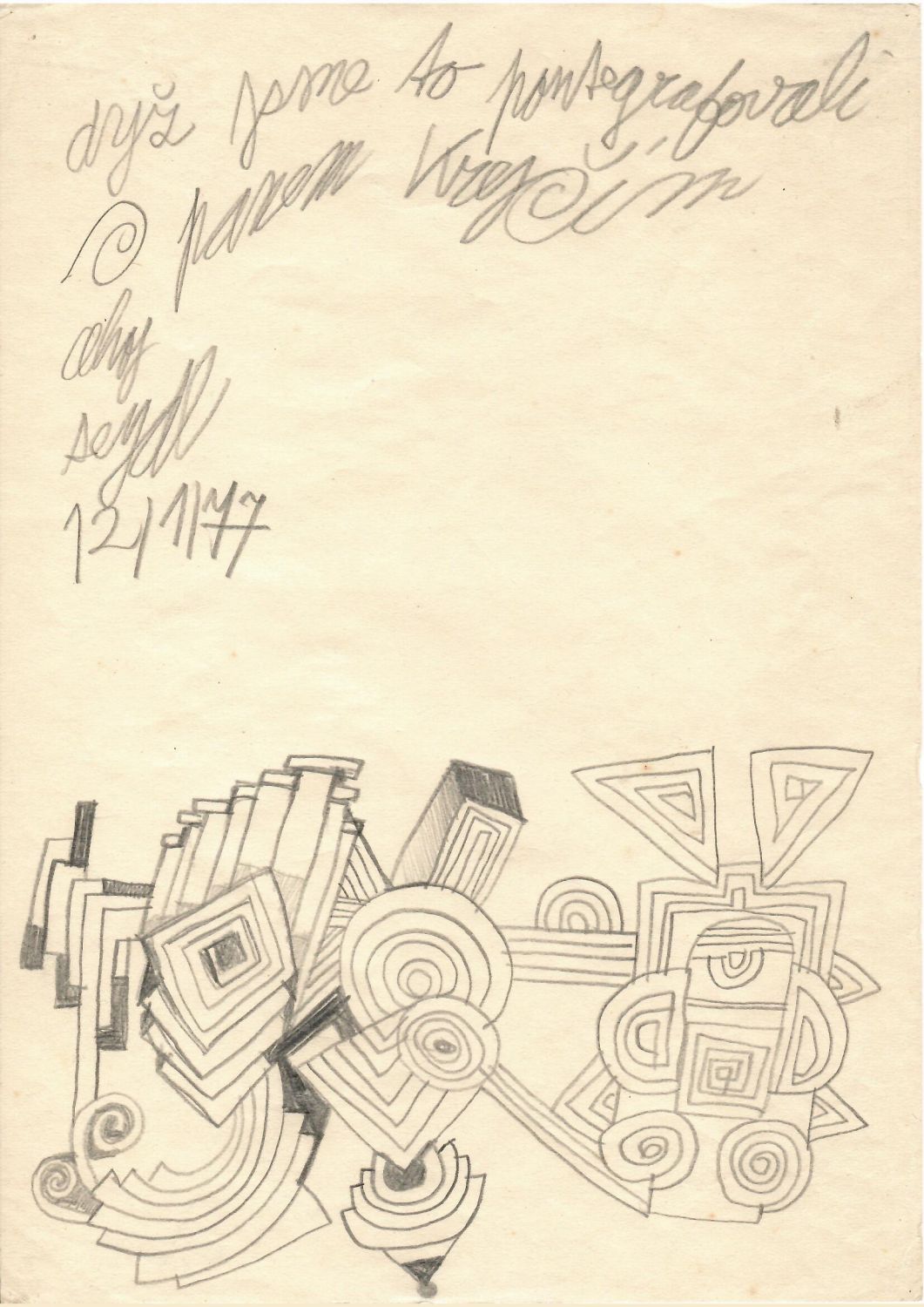 Kresba tužkou s nápisem "dyž jsme to pontegrafovali s panem Krejčím ahoj seydl 12/1/77". Na zadní straně papíru stopy po předchozím uchycení k podkladovému papíru.
