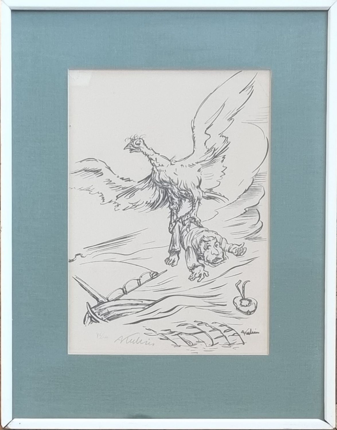 Litografie vpravo dole signovaná v desce, vlevo dole autorem tužkou podepsaná a číslovaná 76/100, tištěno na křídový papír (krom toho bylo 20 tisků na papíře ručním). Práce je vsazena do hluboké světle zelené plátěné pasparty a zarámována v bílém tenkém dřevěném rámu. (A. Hoberg "Das litographische Werk A. Kubin" č. 20; Raabe 141).