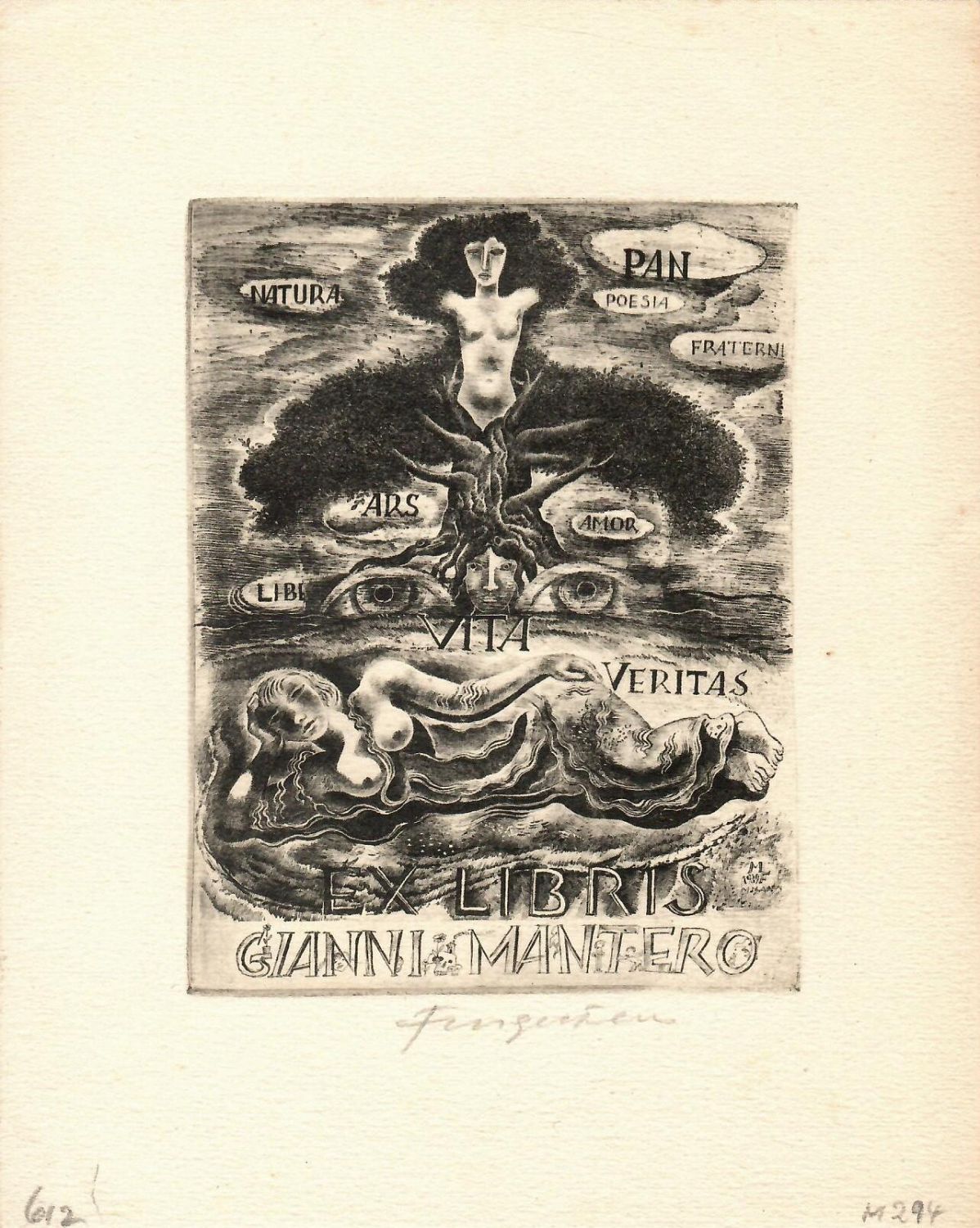 Lept s měkkým krytem, volný list, v desce datovaný a signovaný monogramem, pod deskou autorem tužkou podepsaný, na rubu razítko Fingestenovo. - Deeken 4446. - Dr. Gianni Mantero (1897 - 1985), byl italský architekt, jeden z největších sběratelů ex libris a grafických listů ve 20. století, jeden z významných podporovatelů M. Fingestena v jeho italském exilu.