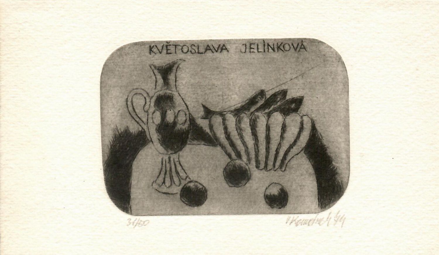 Lept o rozměru desky 73 x 102 mm, celkový rozměr listu 109 x 181 mm. Při spodním okraji tisku autorem tužkou signováno a číslováno. Na zadní straně listu v obou horních rozích zbytek lepící pásky po předchozí adjustaci. Č.ex. 31/50.