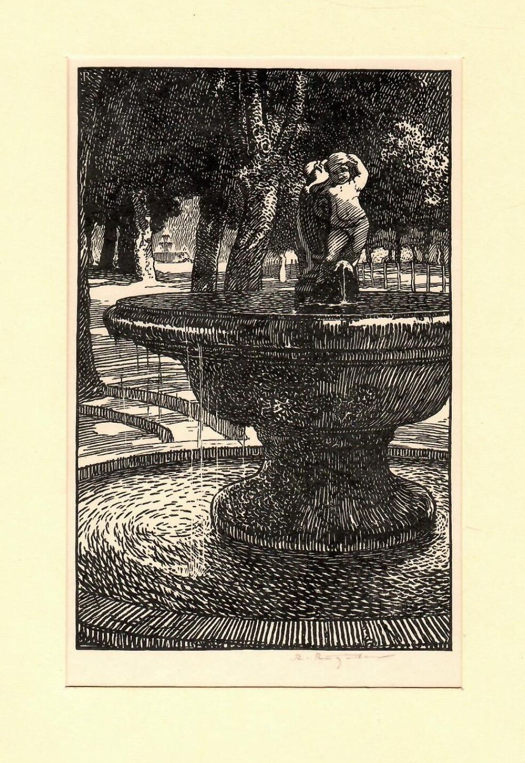 Dřevořez, autorem signováno v desce a při spodním okraji tisku. Na rubu listu razítko sbírky Waldesova obrazárna s č. 1075 a razítko NGGS. List je v obou horních rozích přichycen k papírové paspartě.