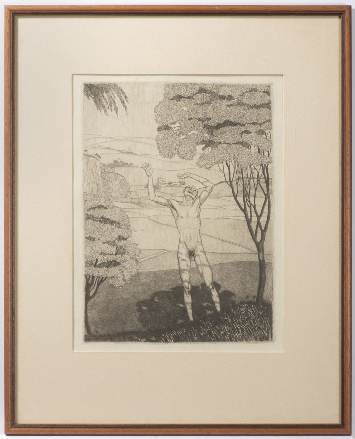 Lept o rozměru desky 320 x 230 mm signovaný v desce vpravo dole. Zarámováno ve světle hnědém rámu o rozměru 520 x 420 mm s hlubokou paspartou.