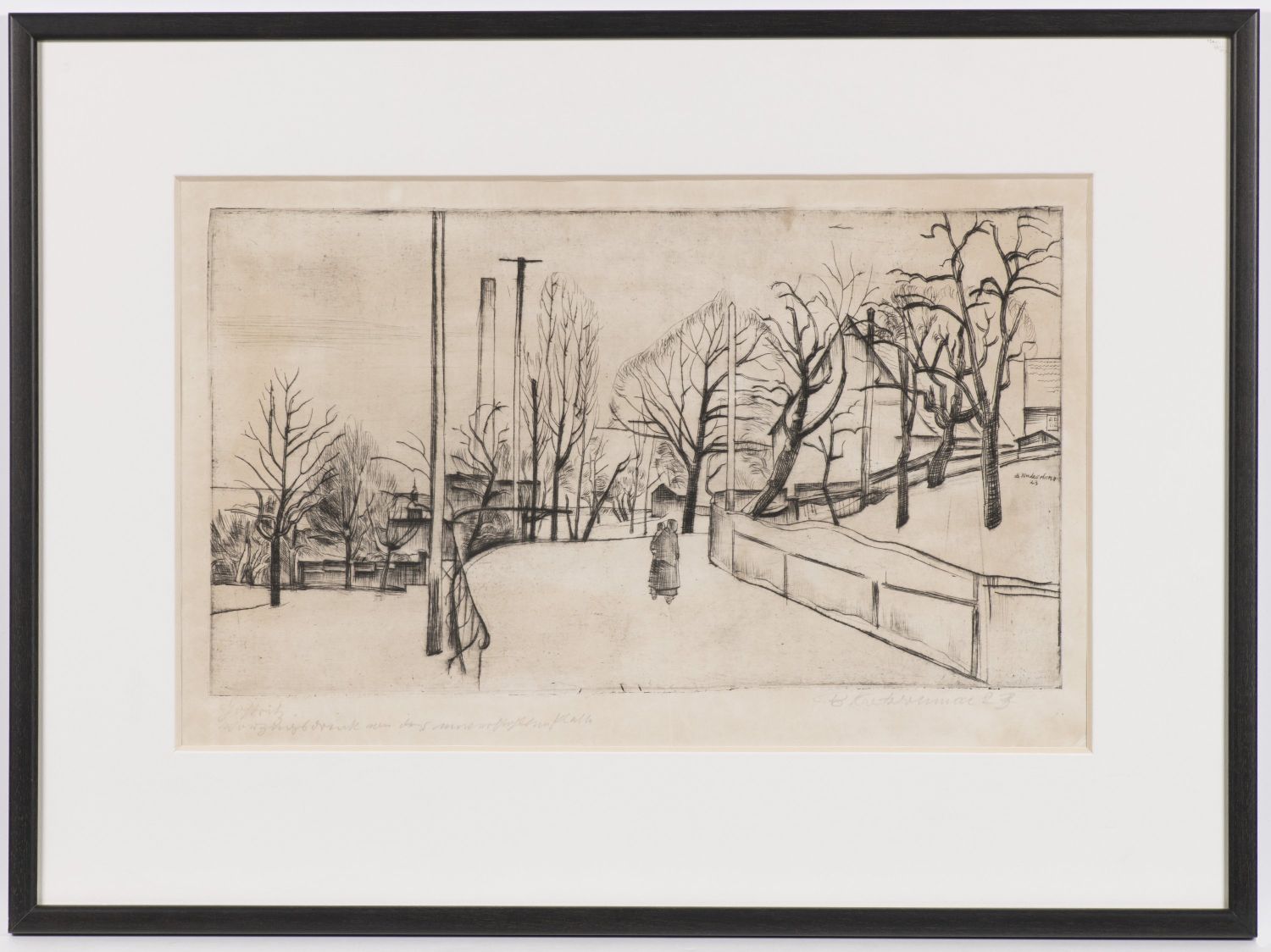 Původní suchá jehla s akvatintou, autorem tužkou vpravo dole pod deskou signovaná a datovaná, vlevo dole tužkou název a autorovy údaje o tisku (zkušební tisk). Reprodukováno v "Bernhard Kretzschmar - Werkverzeichnis der Druckgrafik" na str. 147 pod inventárním číslem R 130. Zarámováno v jednoduchém černém rámu o rozměru 450 x 610 mm v hluboké bílé paspartě.