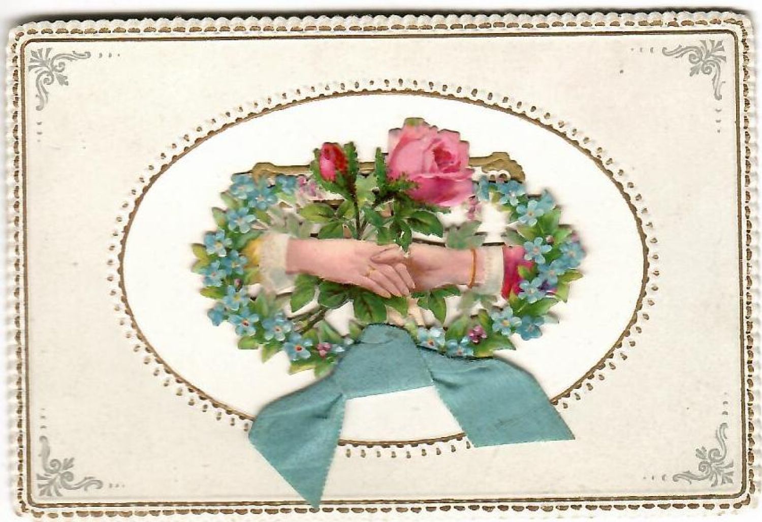 Papírové přání s ozdobným okrajem. Na prostředku pohyblivá vystřihovánka s látkovou mašlí. Po odsunutí vystřihovánky se objeví nápis "Štěstí a blaženost".