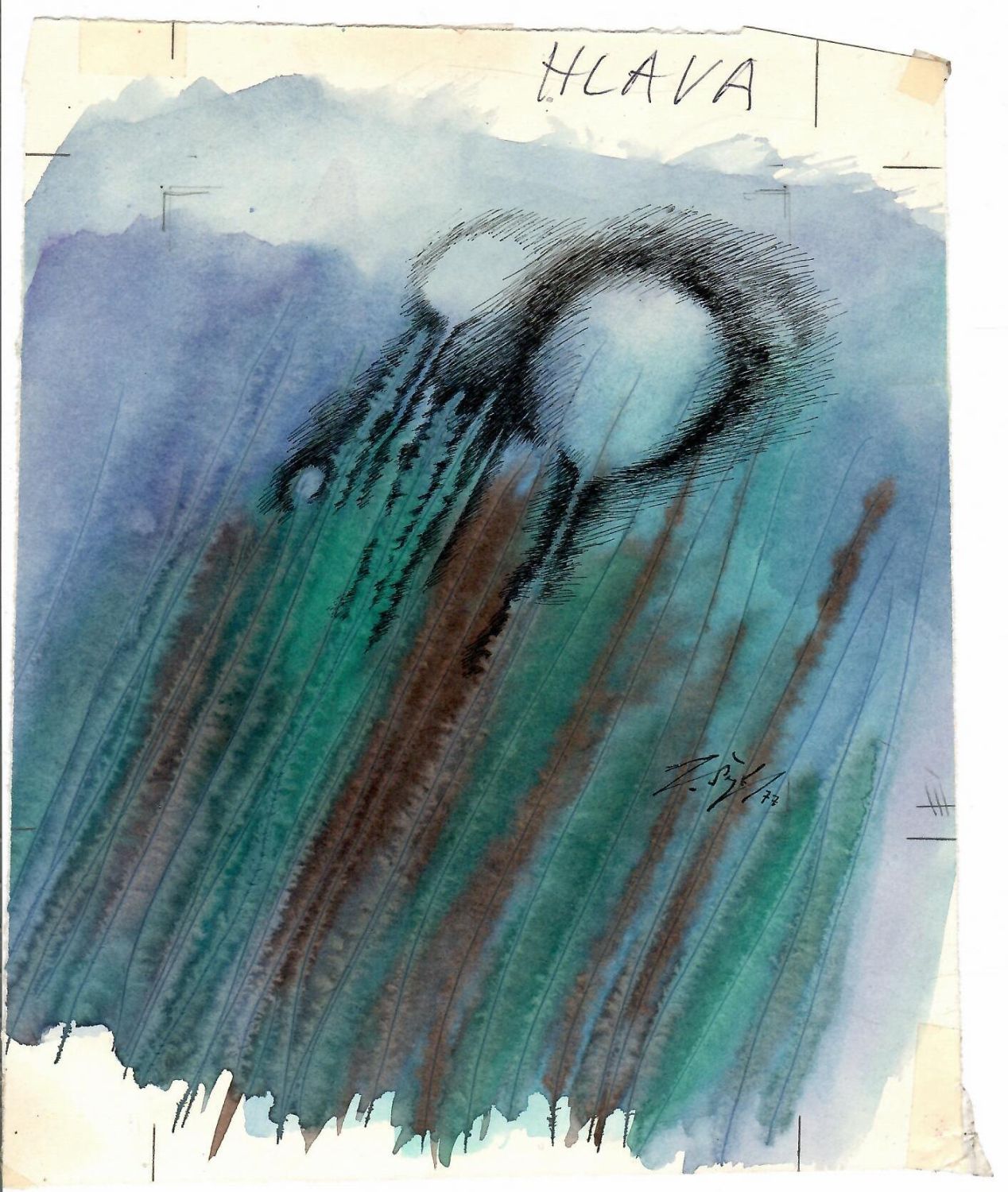 Akvarel s tuší, v levé části uprostřed autorem černým perem podepsaný a datovaný, při horním okraji napsaný název.