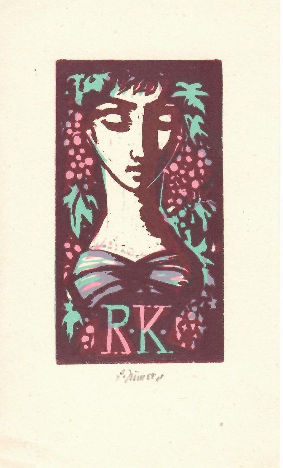 Tříbarevný linoryt, volný list uprostřed dole pod deskou autorkou tužkou podepsaný, v desce vyryt monogram R.K. (Rudolf Klinkovský), na rubu autorčino razítko. (Soupis č. 767)