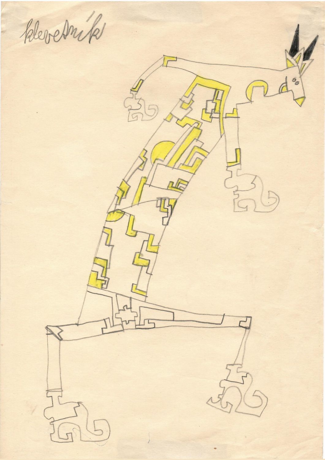 Kresba tužkou kolorovaná zářivě žlutou pastelkou. Na zadní straně zbytky lepící pásky po předchozí adjustaci.