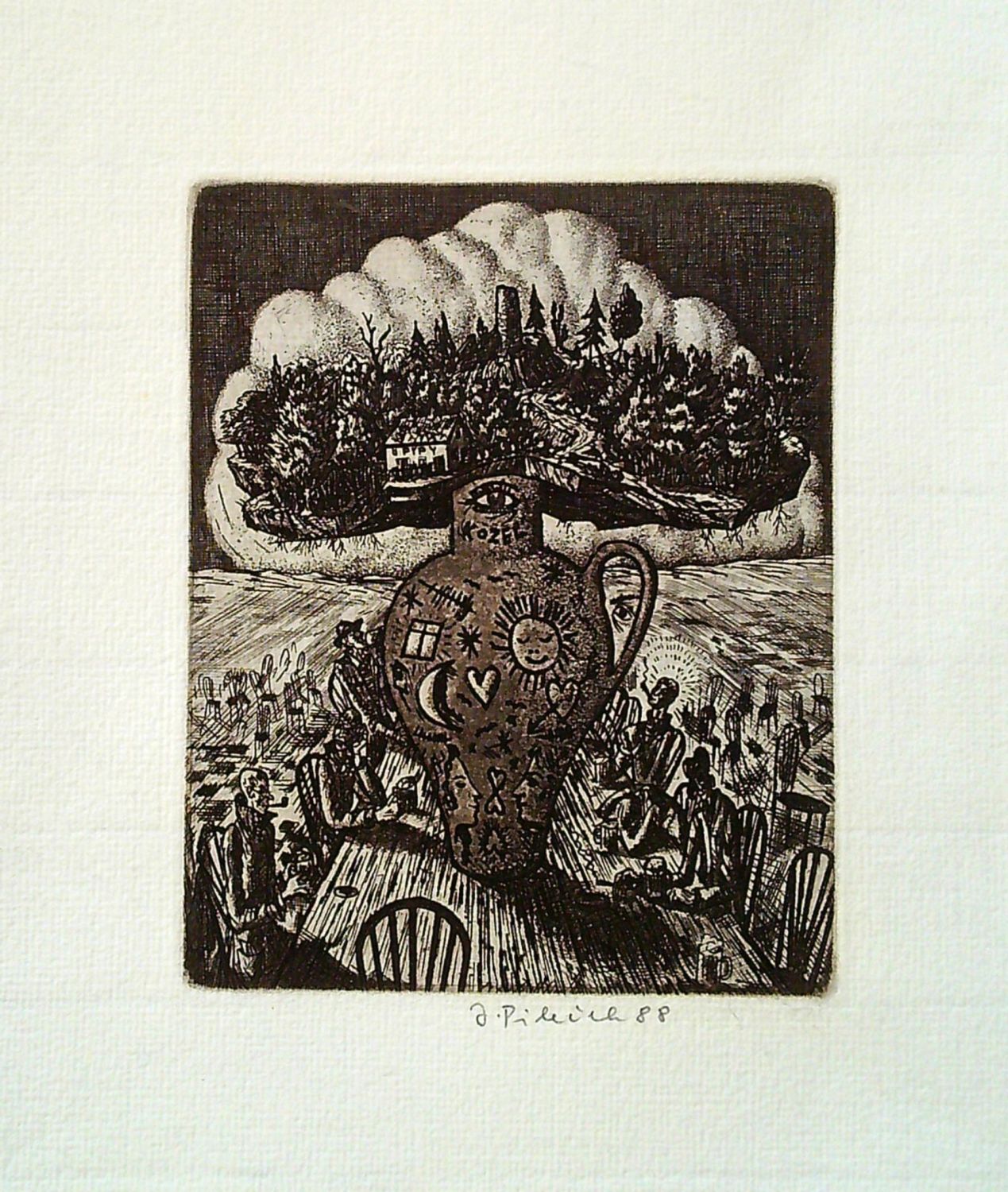 Lept tištěný na ručním rýhovaném papíře, uprostřed dole pod deskou autorem tužkou podepsaný a datovaný, volný list.