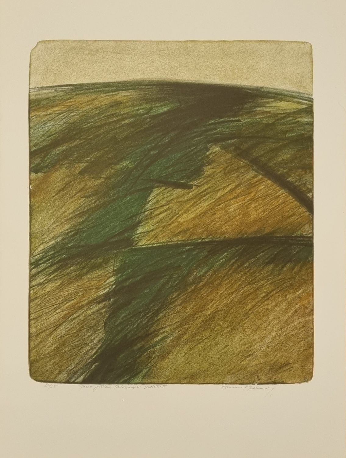 Barevná litografie, vpravo dole autorem tužkou podepsaná, vlevo dole číslo tisku 26/55 a autorův přípis "Panu Jiřímu Šalamounovi srdečně". Volný list.