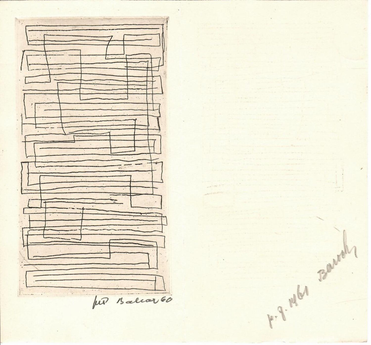 Původní lept, vpravo dole pod deskou autorem tužkou podepsaný a datovaný, v levé části uprostřed přeloženého listu lept, v části pravé tužkou připsáno P.F. 1961 Bauch.