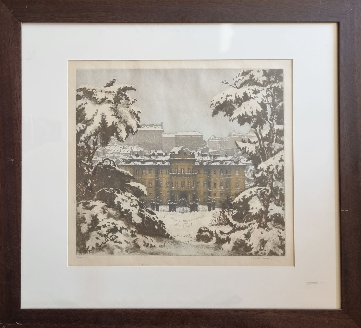 Barevná akvatinta vpravo dole autorem tužkou podepsaná, vlevo dole signovaná též v desce. Práce opatřena bílou paspartou a tmavě hnědým dřevěným rámem.