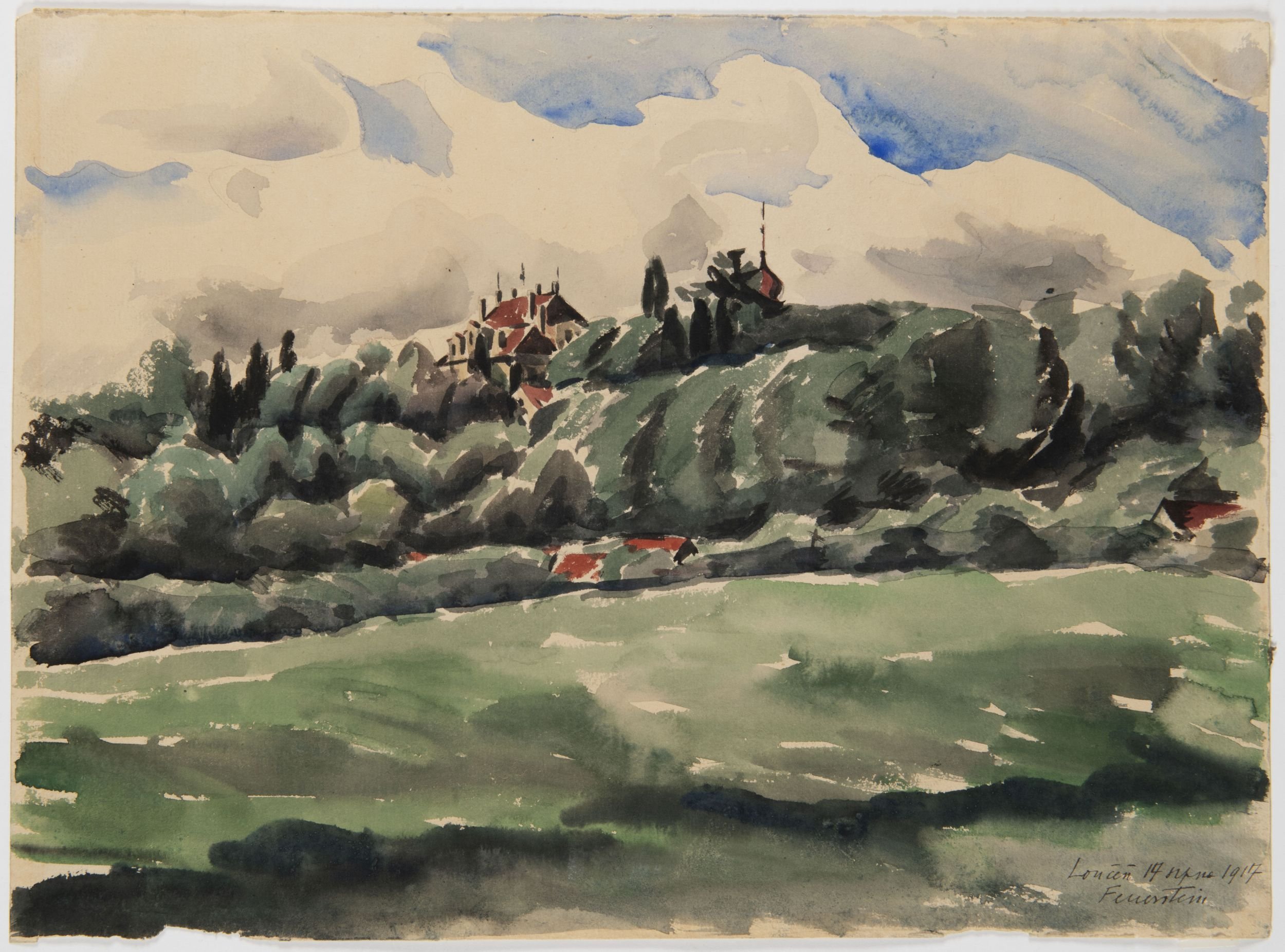 Akvarel na papíře, vpravo dole signovaný a datovaný "14. srpna 1917". Práce je opatřena hlubokou paspartou a světlým přírodním rámem z olše. Akvarel pochází z pozůstalosti Bedřicha Feuersteina.